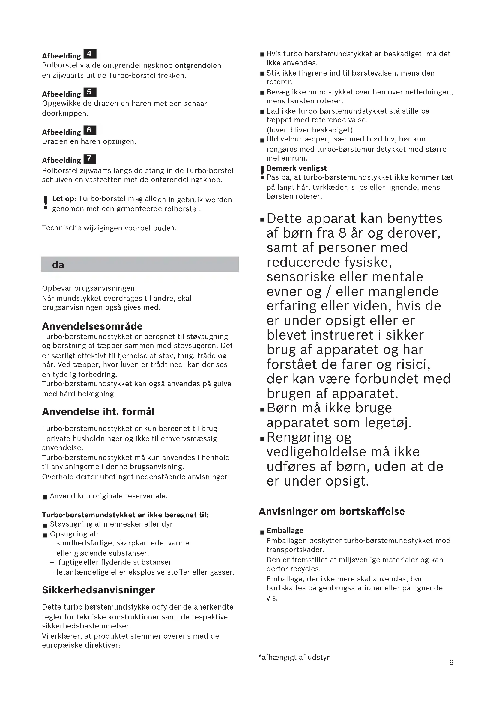 Opbevar brugsanvisningen. Når mundstykket overdrages til andre, skal brugsanvisningen også gives med. Anvendelsesområde Turbo-børstemundstykket er beregnet til støvsugning og børstning af tæpper sammen med støvsugeren. Det er særligt effektivt til fjernelse af støv, fnug, tråde og hår. Ved tæpper, hvor luven er trådt ned, kan der ses en tydelig forbedring. Turbo-børstem undstykket kan også anvendes på gulve med hård belægning. Anvendelse iht. formål Turbo-børstemundstykket er kun beregnet til brug i private husholdninger og ikke til erhvervsmæssig anvendelse. Turbo-børstemundstykket må kun anvendes i henhold til anvisningerne i denne brugsanvisning. Overhold derfor ubeti nget nedenstående anvisninger! Anvend kun originale reservedele. Turbo-børstemundstykket er ikke beregnet til: Støvsugning af mennesker eller dyr Opsugning af: –sundhedsfarlige, skarpkantede, varme eller glødende substanser. – fugtige eller flydende substanser –letantændelige eller eksplosive stoffer eller gasser. Sikkerhedsanvisninger Dette turbo-børstemundstykke opfylder de anerkendte regler for tekniske konstruktioner samt de respektive sikkerhedsbestemmelser. Vi erklærer, at produktet stemmer overens med de europæiske direktiver: *afhængigt af udstyr Hvis turbo-børstemundstykket er beskadiget, må det ikke anvendes. Stik ikke fingrene ind til børstevalsen, mens den roterer. Bevæg ikke mundstykket over hen over netledningen, mens børsten roterer.