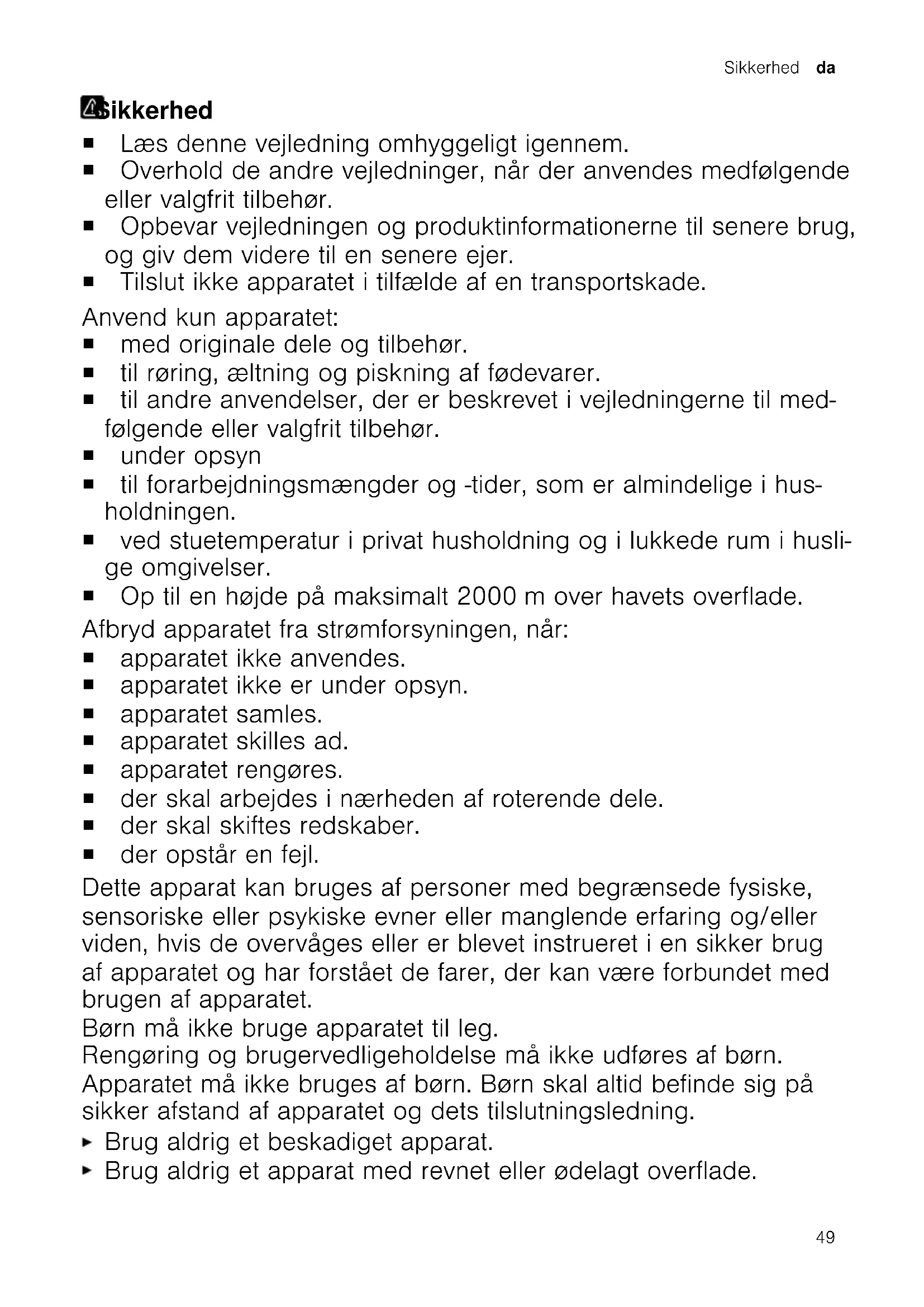 "Fijnafstelling van de professionele klopgarde", Pagina44 Afvoeren van uw oude apparaatAfvoeren van uw oude appa- raat Voer het apparaat milieuvriendelijk af. Bij uw dealer en uw gemeente- of deel- raadskantoor kunt u informatie verkrijgen over de actuele afvoermethoden. Dit apparaat is gekenmerkt in overeenstemming met de Eu- ropese richtlijn 2012/19/EU betreffende afgedankte elek- trische en elektronische appa- ratuur (waste electrical and electronic equipment - WEEE). De richtlijn geeft het kader aan voor de in de EU geldige terugneming en verwerking van oude apparaten. ServicedienstServicedienst Gedetailleerde informatie over de garantie- duur en de garantievoorwaarden in uw land ontvangt u via de QR-code op het meegele- verde document over de servicecontacten en garantievoorwaarden, bij onze klanten- service, uw dealer of op onze website. De contactgegevens van de klantenservice vindt u via de QR-code op het meegelever- de document over de servicecontacten en garantievoorwaarden of op onze website. De informatie conform verordening (EU) 2023/826 vindt u online op www.bosch- home.com op de productpagina en de servicepagina van uw apparaat bij de ge- bruiksaanwijzingen en aanvullende docu- menten. 48Sikkerhed da Sikkerhed Sikkerhed ¡ Læs denne vejledning omhyggeligt igennem. ¡ Overhold de andre vejledninger, når der anvendes medfølgende eller valgfrit tilbehør. ¡ Opbevar vejledningen og produktinformationerne til senere brug, og giv dem videre til en senere ejer. ¡ Tilslut ikke apparatet i tilfælde af en transportskade. Anvend kun apparatet: ¡ med originale dele og tilbehør. ¡ til røring, æltning og piskning af fødevarer. ¡ til andre anvendelser, der er beskrevet i vejledningerne til med- følgende eller valgfrit tilbehør. ¡ under opsyn ¡ til forarbejdningsmængder og -tider, som er almindelige i hus- holdningen. ¡ ved stuetemperatur i privat husholdning og i lukkede rum i husli- ge omgivelser. ¡ Op til en højde på maksimalt 2000m over havets overflade. Afbryd apparatet fra strømforsyningen, når: ¡ apparatet ikke anvendes. ¡ apparatet ikke er under opsyn. ¡ apparatet samles. ¡ apparatet skilles ad. ¡ apparatet rengøres. ¡ der skal arbejdes i nærheden af roterende dele. ¡ der skal skiftes redskaber. ¡ der opstår en fejl. Dette apparat kan bruges af personer med begrænsede fysiske, sensoriske eller psykiske evner eller manglende erfaring og/eller viden, hvis de overvåges eller er blevet instrueret i en sikker brug af apparatet og har forstået de farer, der kan være forbundet med brugen af apparatet. Børn må ikke bruge apparatet til leg. Rengøring og brugervedligeholdelse må ikke udføres af børn. Apparatet må ikke bruges af børn. Børn skal altid befinde sig på sikker afstand af apparatet og dets tilslutningsledning. Brug aldrig et beskadiget apparat. Brug aldrig et apparat med revnet eller ødelagt overflade. 49da Sikkerhed Træk aldrig i nettilslutningsledningen for at afbryde apparatets forbindelse til strømnettet. Tag altid fat i nettilslutningsledningens netstik, og træk det ud. Hvis apparatet eller nettilslutningsledningen er beskadiget, så træk straks nettilslutningsledningens netstik ud, eller slå sikrin- gen fra i sikringsskabet. Kontakt kundeservice.