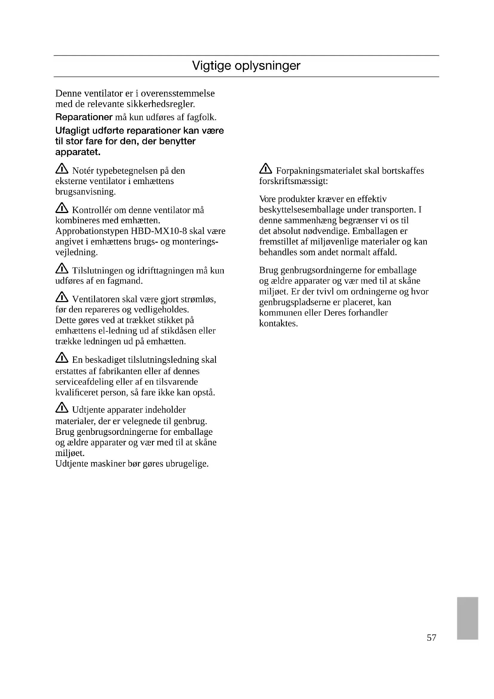 liesituulettimen välinen putkiliitos ja sähköliitos. 몇 Pistokkeen lisäsuojuksen tulee turvallisuussyistä olla aina paikoillaan ja suljettuna.57 Vigtige oplysninger Denne ventilator er i overensstemmelse med de relevante sikkerhedsregler. Reparationer må kun udføres af fagfolk. Ufagligt udførte reparationer kan være til stor fare for den, der benytter apparatet. 몇 Notér typebetegnelsen på den eksterne ventilator i emhættens brugsanvisning. 몇 Kontrollér om denne ventilator må kombineres med emhætten. Approbationstypen HBD-MX10-8 skal være angivet i emhættens brugs- og monterings- vejledning. 몇 Tilslutningen og idrifttagningen må kun udføres af en fagmand. 몇 Ventilatoren skal være gjort strømløs, før den repareres og vedligeholdes. Dette gøres ved at trækket stikket på emhættens el-ledning ud af stikdåsen eller trække ledningen ud på emhætten. 몇 En beskadiget tilslutningsledning skal erstattes af fabrikanten eller af dennes serviceafdeling eller af en tilsvarende kvalificeret person, så fare ikke kan opstå. 몇 Udtjente apparater indeholder materialer, der er velegnede til genbrug. Brug genbrugsordningerne for emballage og ældre apparater og vær med til at skåne miljøet. Udtjente maskiner bør gøres ubrugelige. Denne ventilator er i overensstemmelse med de relevante sikkerhedsregler. Reparationer må kun udføres af fagfolk. Ufagligt udførte reparationer kan være til stor fare for den, der benytter apparatet. 몇 Forpakningsmaterialet skal bortskaffes forskriftsmæssigt: Vore produkter kræver en effektiv beskyttelsesemballage under transporten. I denne sammenhæng begrænser vi os til det absolut nødvendige. Emballagen er fremstillet af miljøvenlige materialer og kan behandles som andet normalt affald. Brug genbrugsordningerne for emballage og ældre apparater og vær med til at skåne miljøet. Er der tvivl om ordningerne og hvor genbrugspladserne er placeret, kan kommunen eller Deres forhandler kontaktes.58 Inden monteringen