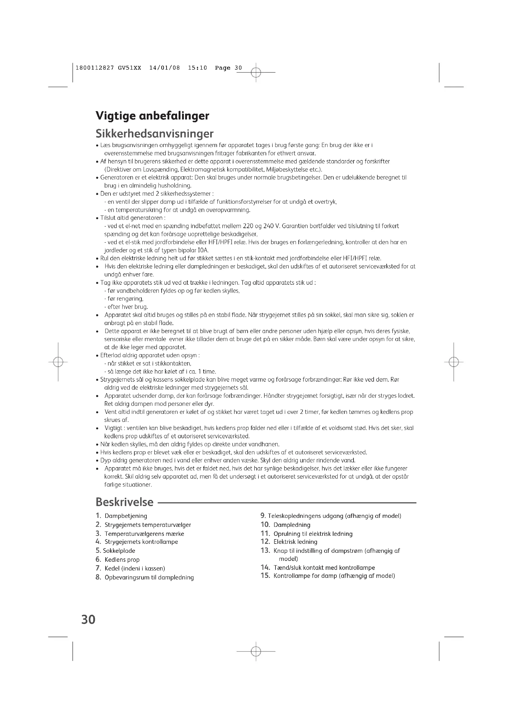 - Apparatet må ikke bruges, hvis det er faldet ned, hvis det har synlige beskadigelser, hvis det lækker eller ikke fungerer korrekt. Skil aldrig selv apparatet ad, men få det undersøgt i et autoriseret serviceværksted for at undgå, at der opstår farlige situationer. Beskrivelse 1800112827 GV51XX 14/01/08 15:10 Page 3031 Forberedelse Hvilken type vand skal man bruge ?