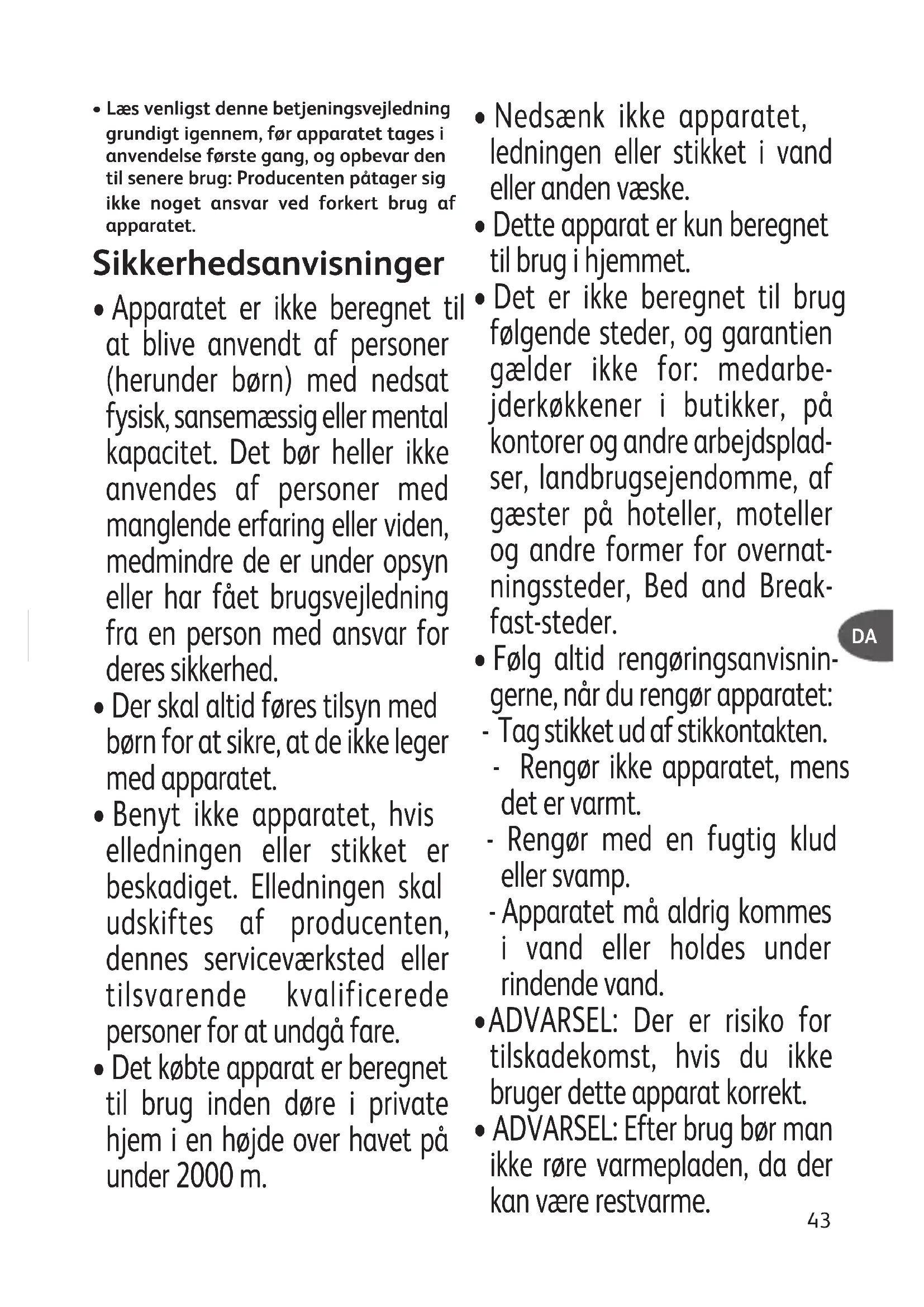 - Apparatet er ikke beregnet til at blive anvendt af personer (herunder børn) med nedsat fysisk, sansemæssig eller mental kapacitet. Det bør heller ikke anvendes af personer med manglende erfaring eller viden, medmindre de er under opsyn eller har fået brugsvejledning fra en person med ansvar for deres sikkerhed.