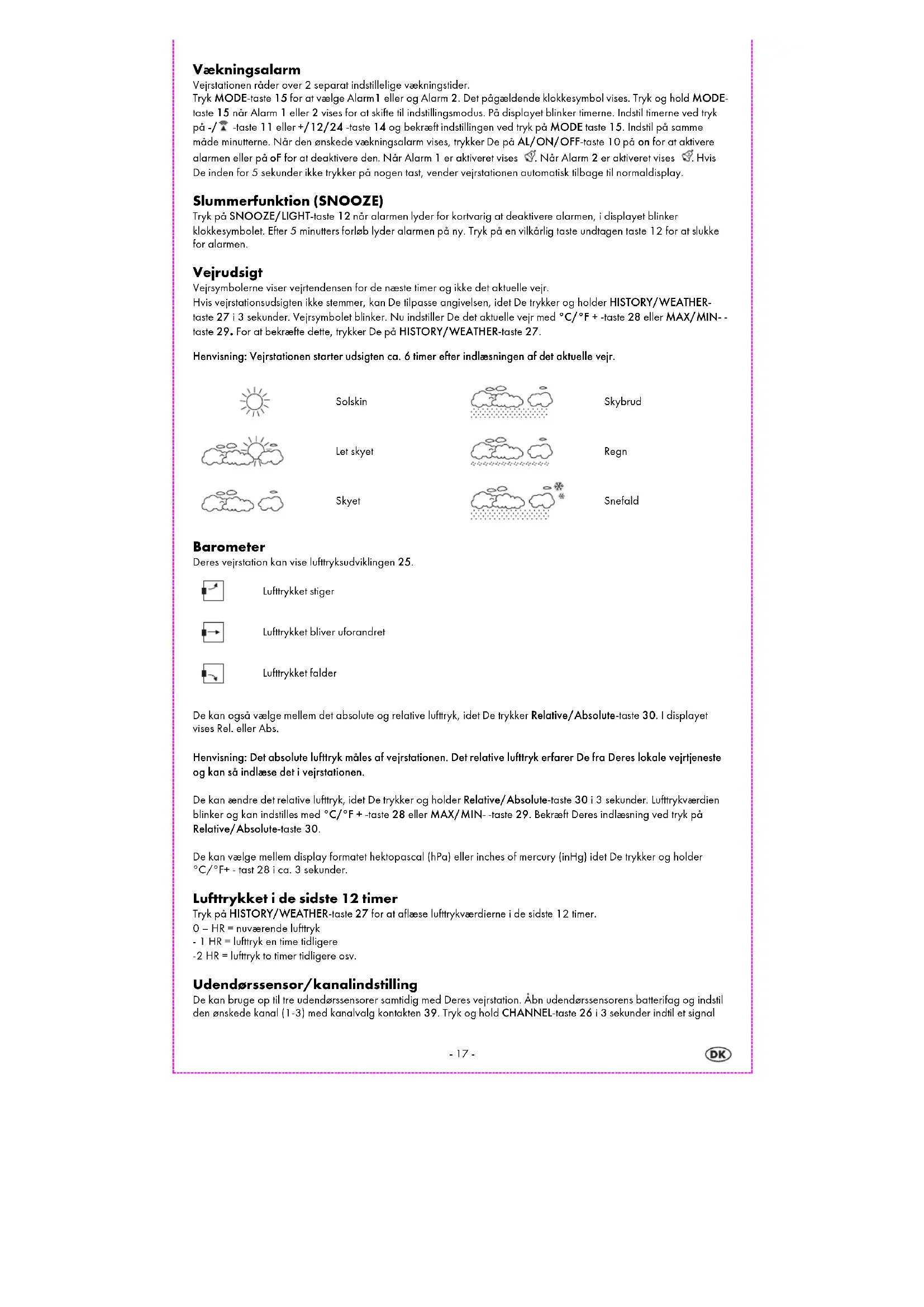Solskin Skybrud Let skyet Regn Skyet Snefald Barometer Deres vejrstation kan vise lufttryksudviklingen 25. Lufttrykket stiger Lufttrykket bliver uforandret Lufttrykket falder De kan også vælge mellem det absolute og relative lufttryk, idet De trykker Relative/Absolute-taste 30. I displayet vises Rel. eller Abs. Henvisning: Det absolute lufttryk måles af vejrstationen. Det relative lufttryk erfarer De fra Deres lokale vejrtjeneste og kan så indlæse det i vejrstationen. De kan ændre det relative lufttryk, idet De trykker og holder Relative/Absolute-taste 30 i 3 sekunder. Lufttrykværdien blinker og kan indstilles med °C/°F + -taste 28 eller MAX/MIN- -taste 29. Bekræft Deres indlæsning ved tryk på Relative/Absolute-taste 30. De kan vælge mellem display formatet hektopascal (hPa) eller inches of mercury (inHg) idet De trykker og holder °C/°F+ - tast 28 i ca. 3 sekunder. Lufttrykket i de sidste 12 timer Tryk på HISTORY/WEATHER-taste 27 for at aflæse lufttrykværdierne i de sidste 12 timer. 0 – HR = nuværende lufttryk - 1 HR = lufttryk en time tidligere -2 HR = lufttryk to timer tidligere osv. Udendørssensor/kanalindstilling De kan bruge op til tre udendørssensorer samtidig med Deres vejrstation. Åbn udendørssensorens batterifag og indstil den ønskede kanal (1-3) med kanalvalg kontakten 39. Tryk og hold CHANNEL-taste 26 i 3 sekunder indtil et signal-