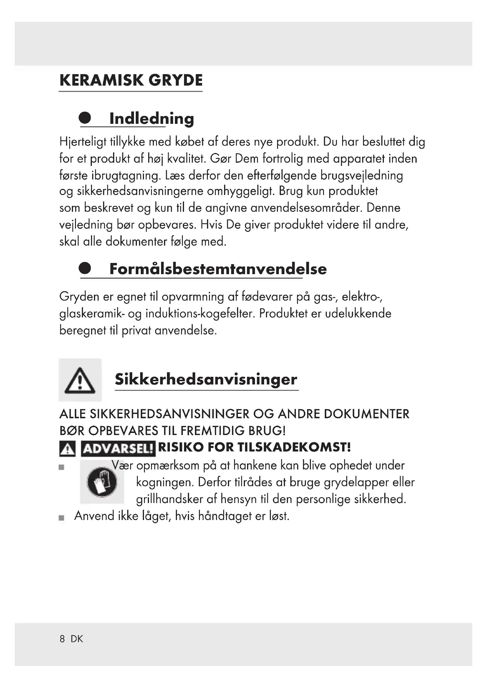 BØR OPBEVARES TIL FREMTIDIG BRUG! RISIKO FOR TILSKADEKOMST! Vær opmærksom på at hankene kan blive ophedet under kogningen. Derfor tilrådes at bruge grydelapper eller grillhandsker af hensyn til den personlige sikkerhed. Anvend ikke låget, hvis håndtaget er løst.9 DK RISIKO FOR MATERIEL SKADE! Under kogning er det meget vigtigt hele tiden at holde øje med gryder og pander hvori der opvarmes fedstoffer. Fedt kan hurtigt blive overophedet og antændt. Hvis fedtet brænder, må det aldrig slukkes med vand! Flammern skal kvæles med et grydelåg eller et tæt udtæppe. For ikke at beskadige den klæbefrie belægning bør der kun anvendes redskaber af varmebestandigt kunststof eller træ. Det der skal koges, bør ikke snittes direkte ned i gryden. Dryppende vådt kød må ikke lægges i varmt fedt. Fedt der kommer på en glødendekogeplade, kan let gå i brand. Høje temperaturer kan misfarve produktets yderside. Dette er ikke et tegn på materialefejl, og det påvirker ikke produktets kvalitet og funktion. Der bør bruges en kogeplade med en størrelse der svarer til grydens for at varmetab kan undgås. Artiklen er egnet til at holde madvarer varme i ovnen (maks. 150 °C i 1 time). Det varme produkt må aldrig holdes under rindende koldt vand. Produktets bunde kan tage skade eller falde af produktet. Produktet er egnet til maskinvask. Gentagen rengøring af produktet med skurende rengøringsmidler kan beskadige det og medføre misfarvning. Rensning i opvaskemaskine kan føre til misfarvning af aluminiumsdelene. PAS PÅ! Glaslåget er skrøbeligt / ikke stødfast!10 DK Når gryden vaskes i hånden, rengøres den med varmt vand og et almindeligt skyllemiddel. Undgå brug af skarpe eller spidse genstande for ikke at beskadige materialet. ADVARSEL! RIDSER! Undgå at skubbe og trække kogegrejet på glaskeramiske kogeplader! Før madlavningen påbegyndes, anbefaler vi, at kogepladens overflade og kogegrejets bund rengøres med en ren, fnugfri klud (fx mikrofiber). Herved kan ridser forebygges. Bemærk venligst, at der kan forekomme lettere misfarvninger af dette produkt på grund af den lyse farve. Disse misfarvninger kan henføres til almindelig anvendelse af produktet og har ingen indflydelse på belægningens kvalitet og brugbarhed. Bemærkninger til induktionskogeplader J Bemærk: der kan opstå støj under visse forhold på grund af elektromagnetiske egenskaber for varmekilde i forhold til gryde / pande. J Dette er helt normalt og betyder ikke at induktionskogepladen eller køkkengrejet har taget skade. J Anbring gryde / pande midt på induktionskogepladen. J ADVARSEL! Hurtig opvarmningshastighed. Køkkengrejet må ikke overopvarmes ved opvarmning.11 DK J Lokalet skal udluftes grundigt i tilfælde af overopvarmning af køkkengrej. J Dette produkt kombinerer fordelene ved køkkengrej af aluminium, som lav vægt og høj varmeledningsevne med fordelene ved induktionsopvarmning. For at gøre dette muligt er der indbygget et magnetisk stålelement i aluminiumsbunden. Bunden er ikke magnetisk over hele fladen, og det kan derfor forekomme at induktionsspolen ikke reagerer, hvis induktionskogefeltet er tydeligt større end bunddiameteren. Dette er ikke en kvalitetsmangel og har ingen indflydelse på funktionaliteten. For at sikre optimal funktion, bør produktet stilles på det induktionskogefelt, der passer til bunddiameteren. Brugen J Før gryden tages i brug skal eventuelle etiketter fjernes, og gryden skylles godt med varmt vand. J Inden første anvendelse koges vand op 2 til 3 gange i gryden, for at fjerne eventuelle produktionsrester. J En gryde der er tom eller fyldt med mad til stegning må ikke overopvarmes, idet sliplet-effekten forsvinder eller belægningen kan tage skade.12 DK Bortskaffelse Emballagen består af miljøvenlige materialer der kan bortskaffes over genbrugsstationen. Du kan høre mere om mulighederne for bortskaffelse af et udtjent produkt ved at henvende dig til din kommune eller din bys forvaltning. Garanti Produktet blev produceret omhyggeligt efter de strengeste kvalitetskrav og kontrolleret grundigt inden levering. Hvis der forekommer mangler ved dette produkt, så har de juridiske rettigheder over for sælgeren af dette produkt. Disse juridiske rettigheder indskrænkes ikke af vores garanti, der beskrives i det følgende. De får 3 års garanti fra købsdatoen på dette produkt. Garantifristen begynder med købsdatoen. Opbevar den originale kassebon på et sikkert sted. Denne kassebon behøves som dokumentation for købet. Hvis der inden for 3 år fra købsdatoen af for dette produkt opstår en materiale- eller fabrikationsfejl, bliver produktet repareret eller erstattet – efter vores valg – af os uden omkostninger for dem. Garantien bortfalder, hvis produktet bliver beskadiget eller ikke anvendes eller vedligeholdes korrekt. Garantien gælder for materiale- eller fabrikationsfejl. Denne garanti dækker ikke produktdele, som er udsat for normalt slid og derfor kan betragtes som normale sliddele (f.eks. batterier) eller ved skader på skrøbelige dele; f.eks. kontakter, akkumulatorer som er fremstillet af glas.CASSEROLE EN CÉRAMIQUE Introduction Nous vous félicitons pour l’achat de votre nouveau produit. Vous avez opté pour un produit de grande qualité. Avant la première mise en service, vous devez vous familiariser avec toutes les fonctions du produit. Veuillez lire attentivement le mode d’emploi ci-dessous et les consignes de sécurité. N’utilisez le produit que pour l’usage décrit et les domaines d’application cités. Conservez ces instructions. Si vous donnez le produit à des tiers, remettez-leur également la totalité des documents. Utilisation conforme à l’usage prévu La casserole est conçue pour réchauffer des aliments sur des champs de cuisson à gaz, électriques, vitro-céramiques, halogènes ou à induction. Ce produit est destiné uniquement à un usage privé. Consignes de sécurité CONSERVER TOUTES LES CONSIGNES DE SÉ