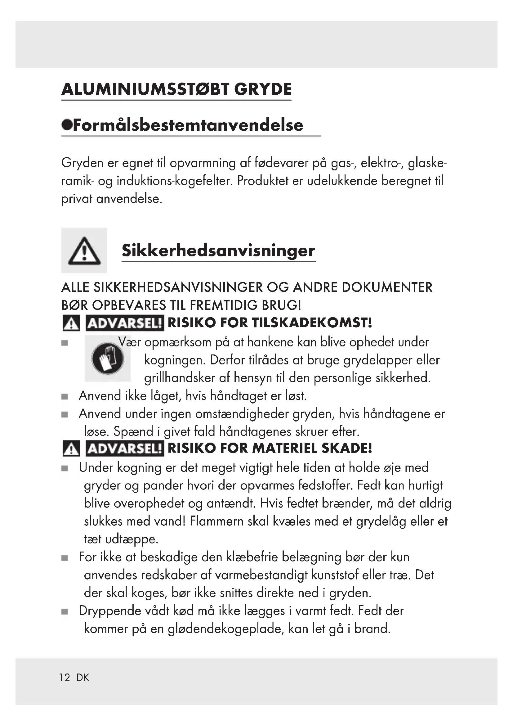 Formålsbestemt anvendelse Gryden er egnet til opvarmning af fødevarer på gas-, elektro-, glaske- ramik- og induktions-kogefelter. Produktet er udelukkende beregnet til privat anvendelse. Sikkerhedsanvisninger