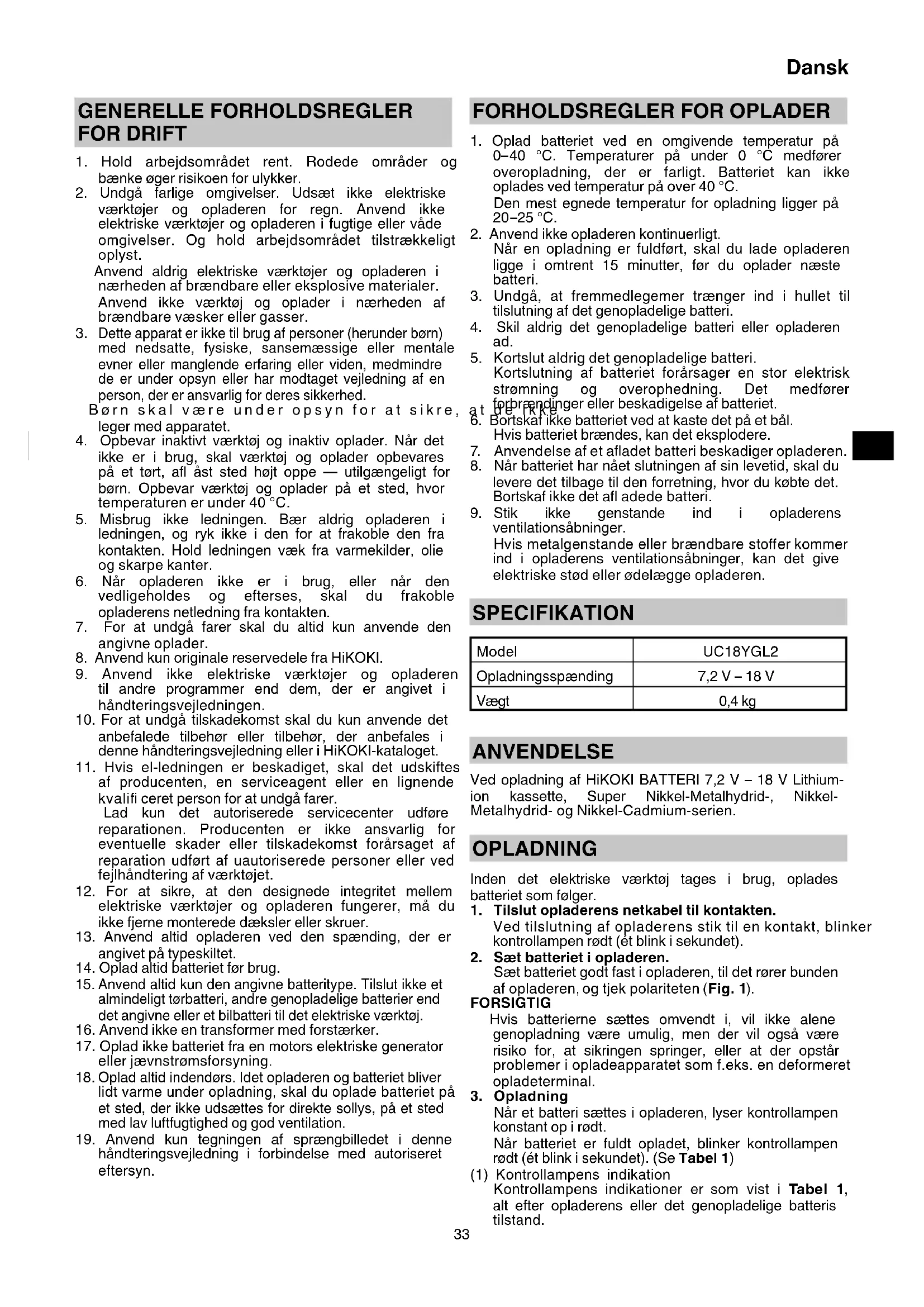 ventilationsåbninger. Hvis metalgenstande eller brændbare stoff er kommer ind i opladerens ventilationsåbninger, kan det give elektriske stød eller ødelægge opladeren. SPECIFIKATION Model UC18YGL2 Opladningsspænding 7,2 V – 18 V Vægt 0,4 kg ANVENDELSE Ved opladning af HiKOKI BATTERI 7,2 V – 18 V Lithium- ion kassette, Super Nikkel-Metalhydrid-, Nikkel- Metalhydrid- og Nikkel-Cadmium-serien. OPLADNING Inden det elektriske værktøj tages i brug, oplades batteriet som følger.