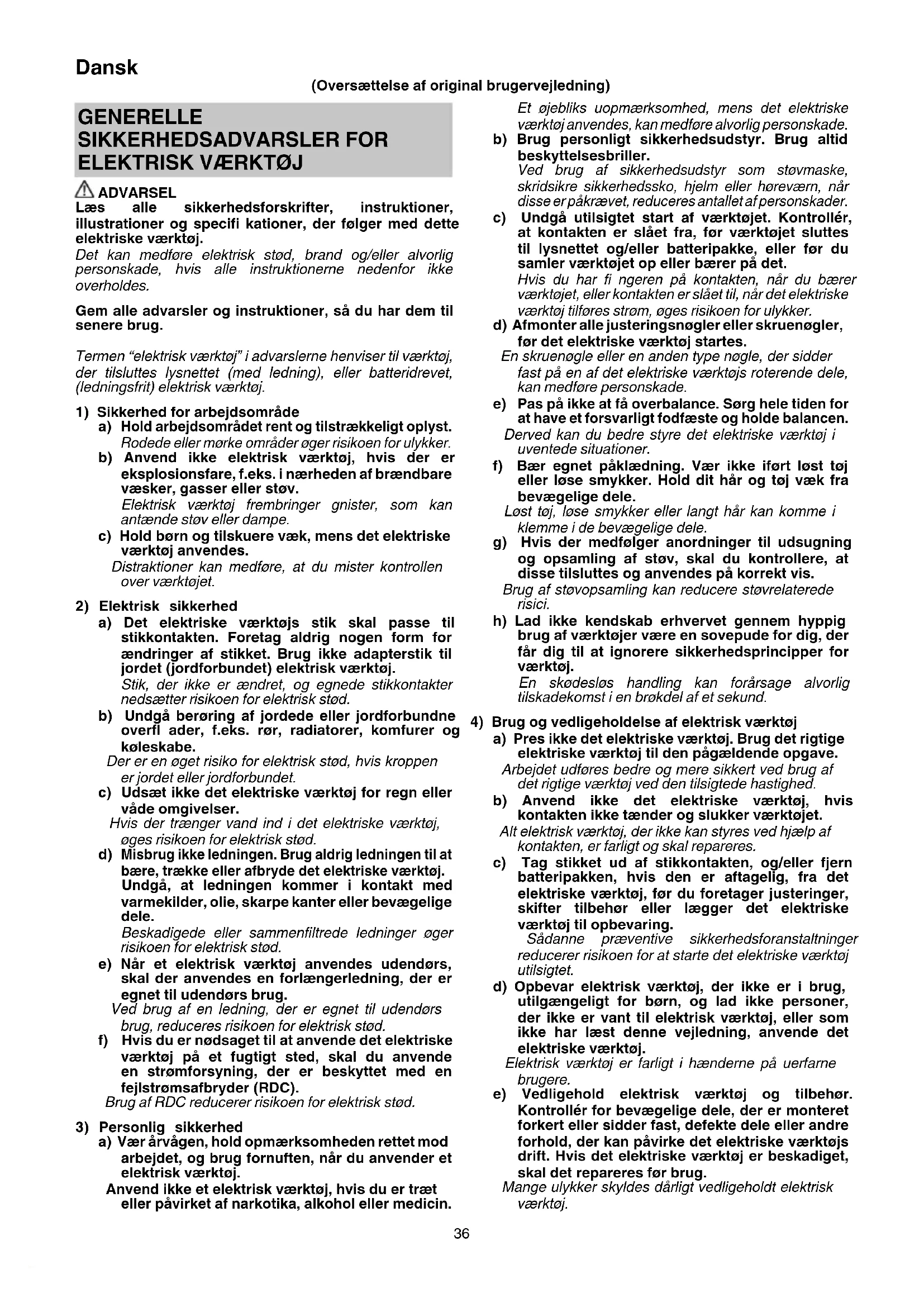 ADVARSEL Læs alle sikkerhedsforskrifter, instruktioner, illustrationer og specifi kationer, der følger med dette elektriske værktøj. Det kan medføre elektrisk stød, brand og/eller alvorlig personskade, hvis alle instruktionerne nedenfor ikke overholdes. Gem alle advarsler og instruktioner, så du har dem til senere brug. Termen “elektrisk værktøj” i advarslerne henviser til værktøj, der tilsluttes lysnettet (med ledning), eller batteridrevet, (ledningsfrit) elektrisk værktøj.
