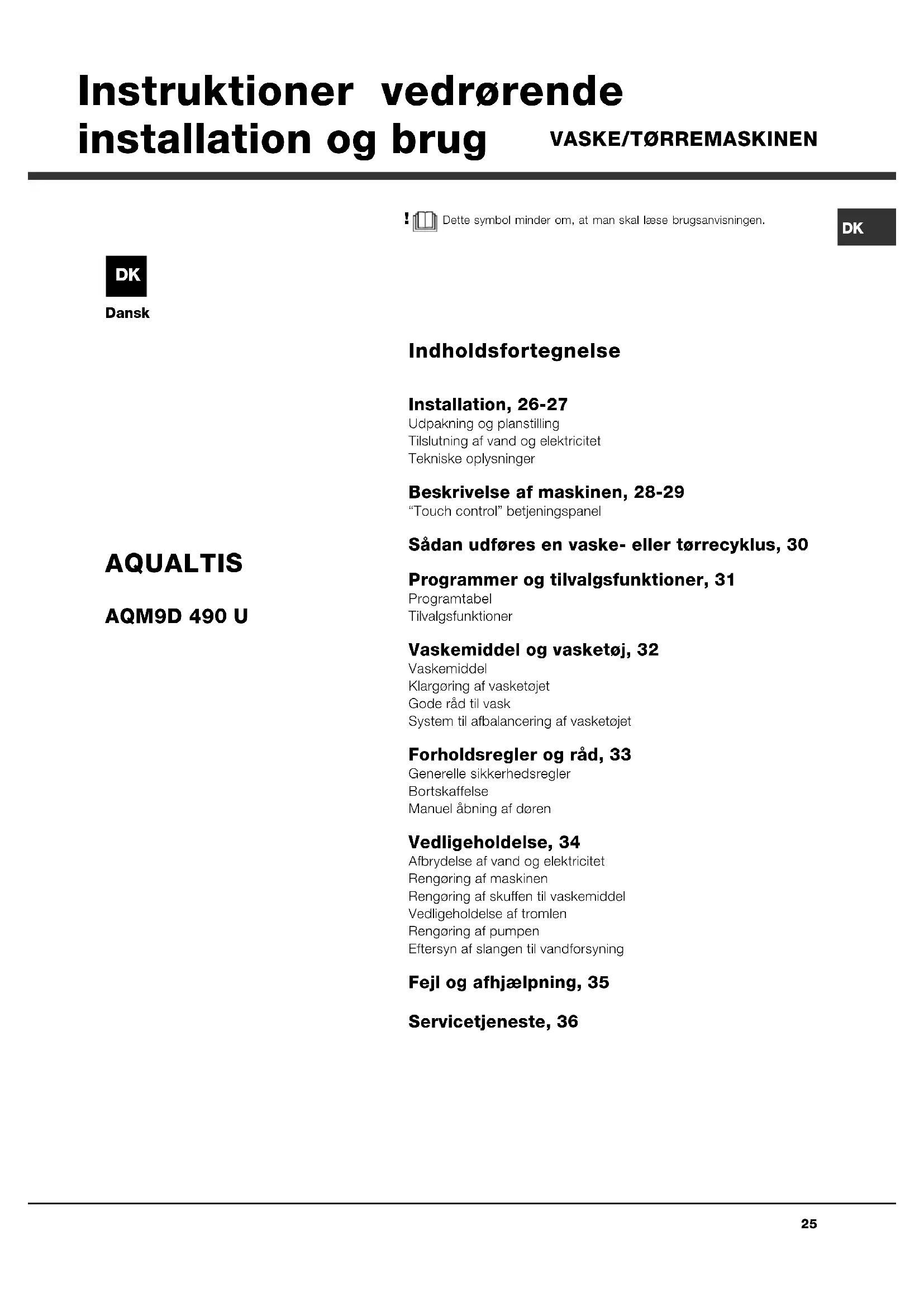 Dansk Indholdsfortegnelse Installation, 26-27 Udpakning og planstillingTilslutning af vand og elektricitetTekniske oplysninger Beskrivelse af maskinen, 28-29 Touch control betjeningspanel Sådan udføres en vaske- eller tørrecyklus, 30 Programmer og tilvalgsfunktioner, 31 ProgramtabelTilvalgsfunktioner Vaskemiddel og vasketøj, 32 VaskemiddelKlargøring af vasketøjetGode råd til vaskSystem til afbalancering af vasketøjet Forholdsregler og råd, 33 Generelle sikkerhedsreglerBortskaffelseManuel åbning af døren Vedligeholdelse, 34 Afbrydelse af vand og elektricitetRengøring af maskinenRengøring af skuffen til vaskemiddelVedligeholdelse af tromlenRengøring af pumpenEftersyn af slangen til vandforsyning Fejl og afhjælpning, 35 Servicetjeneste, 36