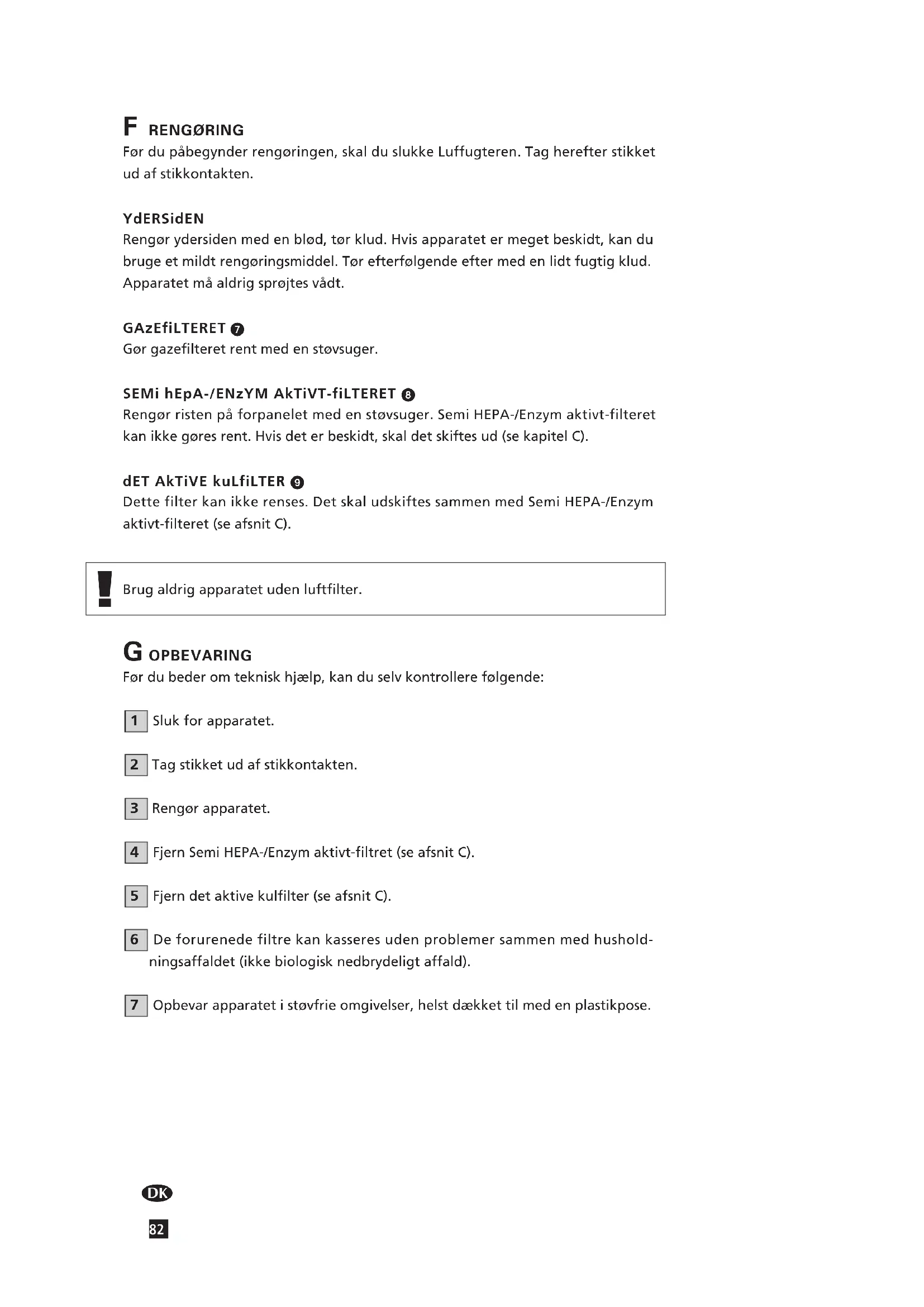 Førdupåbegynderrengøringen,skalduslukkeLuffugteren.Tagherefterstikketudafstikkontakten. YdERSidEN Rengørydersidenmedenblød,tørklud.Hvisapparatetermegetbeskidt,kandubrugeetmildtrengøringsmiddel.Tørefterfølgendeeftermedenlidtfugtigklud.Apparatetmåaldrigsprøjtesvådt. GAzEfiLTERET Gørgazefilteretrentmedenstøvsuger. SEMi hEpA-/ENzYM AkTiVT-fiLTERET Rengørristenpåforpaneletmedenstøvsuger.SemiHEPA-/Enzymaktivt-filteretkanikkegøresrent.Hvisdeterbeskidt,skaldetskiftesud(sekapitelC). dET AkTiVE kuLfiLTER Dettefilterkanikkerenses.DetskaludskiftessammenmedSemiHEPA-/Enzymaktivt-filteret(seafsnitC).Brugaldrigapparatetudenluftfilter. G OPBEVARING Førdubederomtekniskhjælp,kanduselvkontrollerefølgende: