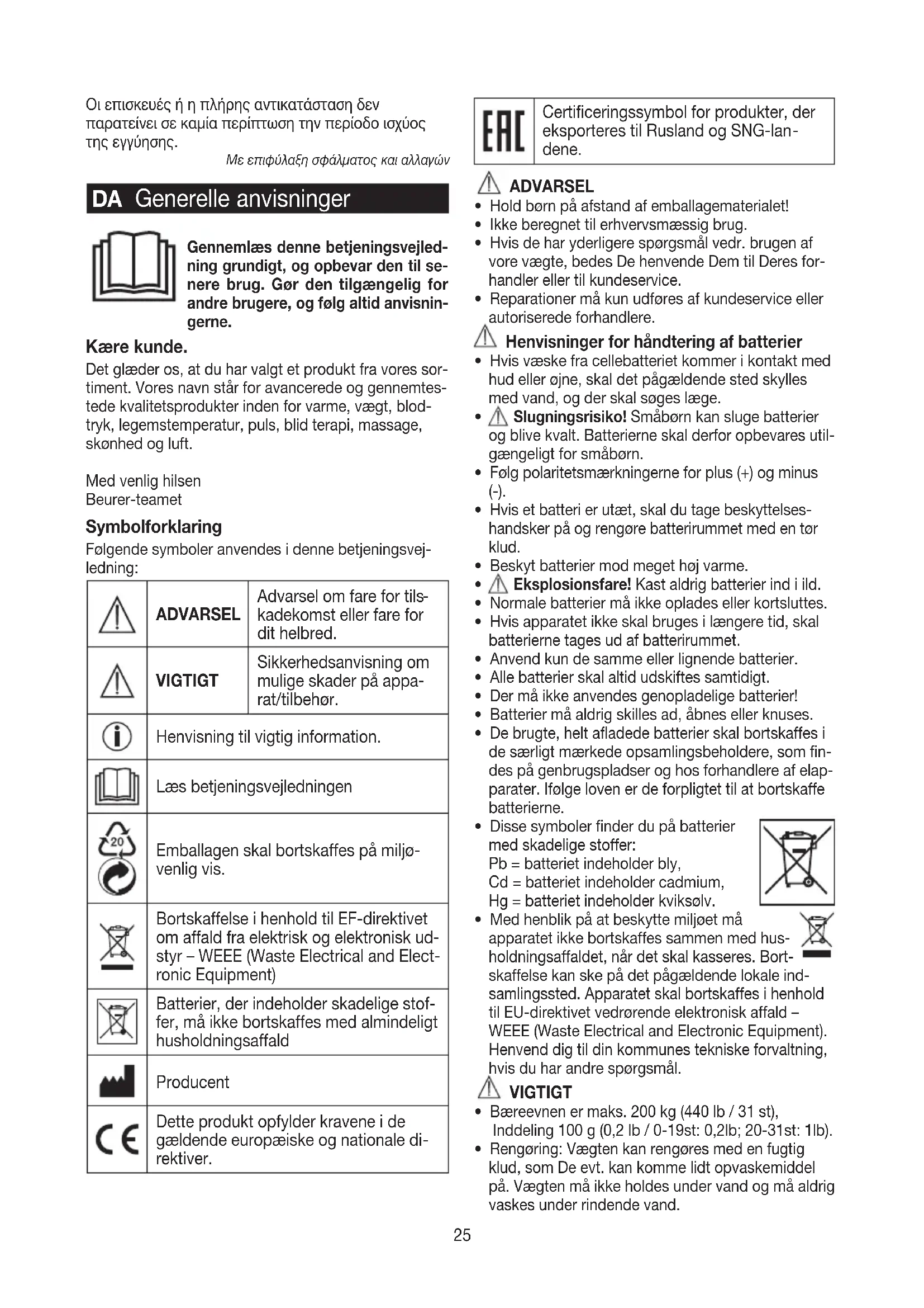 kadekomst eller fare for dit helbred. VIGTIGT Sikkerhedsanvisning om mulige skader på appa- rat/tilbehør. Henvisning til vigtig information. Læs betjeningsvejledningen Emballagen skal bortskaffes på miljø- venlig vis. Bortskaffelse i henhold til EF-direktivet om affald fra elektrisk og elektronisk ud
