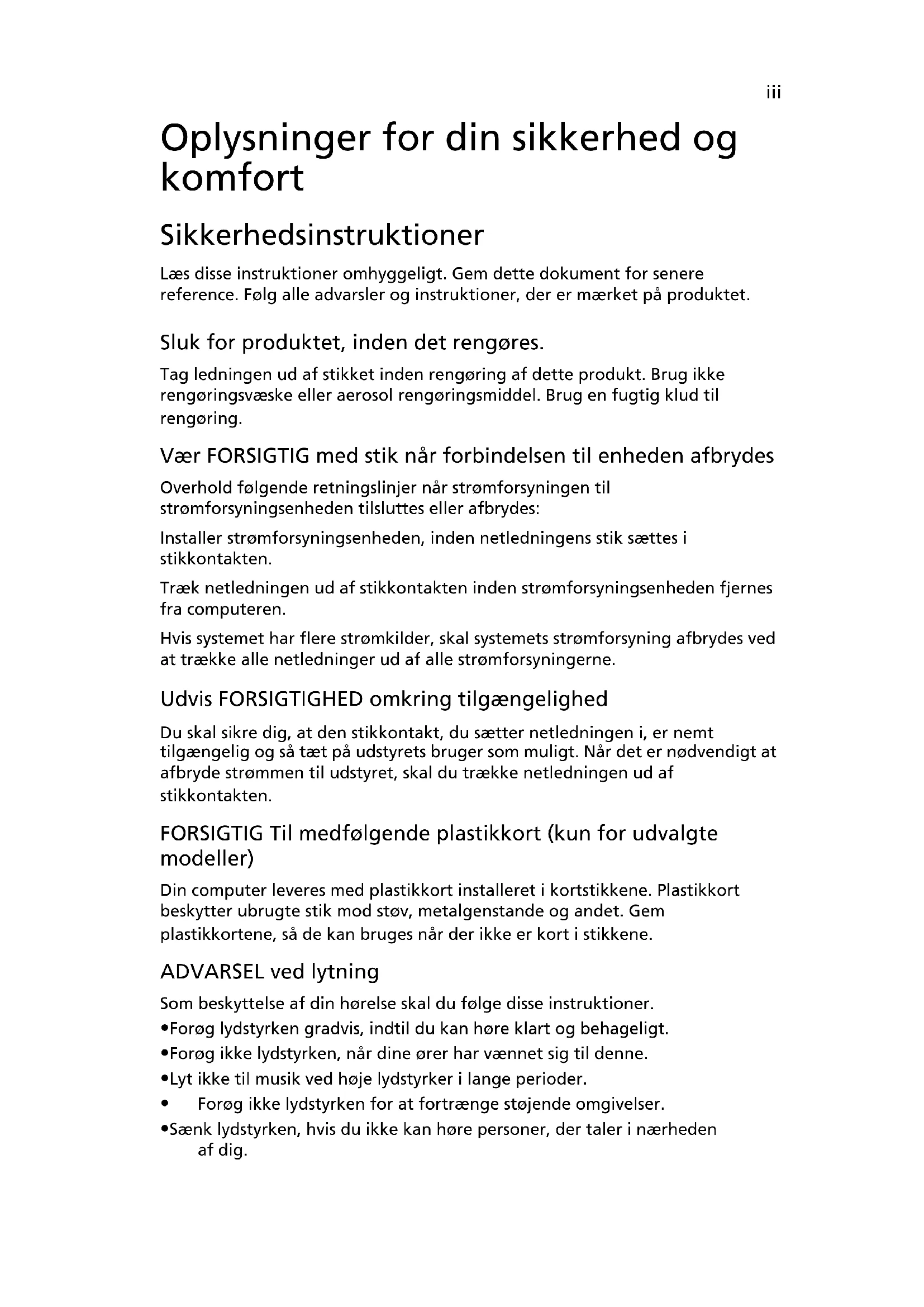 - v'n Pixel fault class Class IITravelMate Seriens Fælles brugervejledningModelnummer: ____________________________________ Serienummer: _____________________________________ Købsdato: _________________________________________ Købt hos: _________________________________________ © 2011 Alle Rettigheder Forbeholdes. TravelMate Seriens Fælles brugervejledning Oprindeligt udgivet: 02/2011iii Oplysninger for din sikkerhed og komfort Sikkerhedsinstruktioner Læs disse instruktioner omhyggeligt. Gem dette dokument for senere reference. Følg alle advarsler og instruktioner, der er mærket på produktet. Sluk for produktet, inden det rengøres. Tag ledningen ud af stikket inden rengøring af dette produkt. Brug ikke rengøringsvæske eller aerosol rengøringsmiddel. Brug en fugtig klud til rengøring. Vær FORSIGTIG med stik når forbindelsen til enheden afbrydes Overhold følgende retningslinjer når strømforsyningen til strømforsyningsenheden tilsluttes eller afbrydes: Installer strømforsyningsenheden, inden netledningens stik sættes i stikkontakten. Træk netledningen ud af stikkontakten inden strømforsyningsenheden fjernes fra computeren. Hvis systemet har flere strømkilder, skal systemets strømforsyning afbrydes ved at trække alle netledninger ud af alle strømforsyningerne. Udvis FORSIGTIGHED omkring tilgængelighed Du skal sikre dig, at den stikkontakt, du sætter netledningen i, er nemt tilgængelig og så tæt på udstyrets bruger som muligt. Når det er nødvendigt at afbryde strømmen til udstyret, skal du trække netledningen ud af stikkontakten. FORSIGTIG Til medfølgende plastikkort (kun for udvalgte modeller) Din computer leveres med plastikkort installeret i kortstikkene. Plastikkort beskytter ubrugte stik mod støv, metalgenstande og andet. Gem plastikkortene, så de kan bruges når der ikke er kort i stikkene. ADVARSEL ved lytning Som beskyttelse af din hørelse skal du følge disse instruktioner.