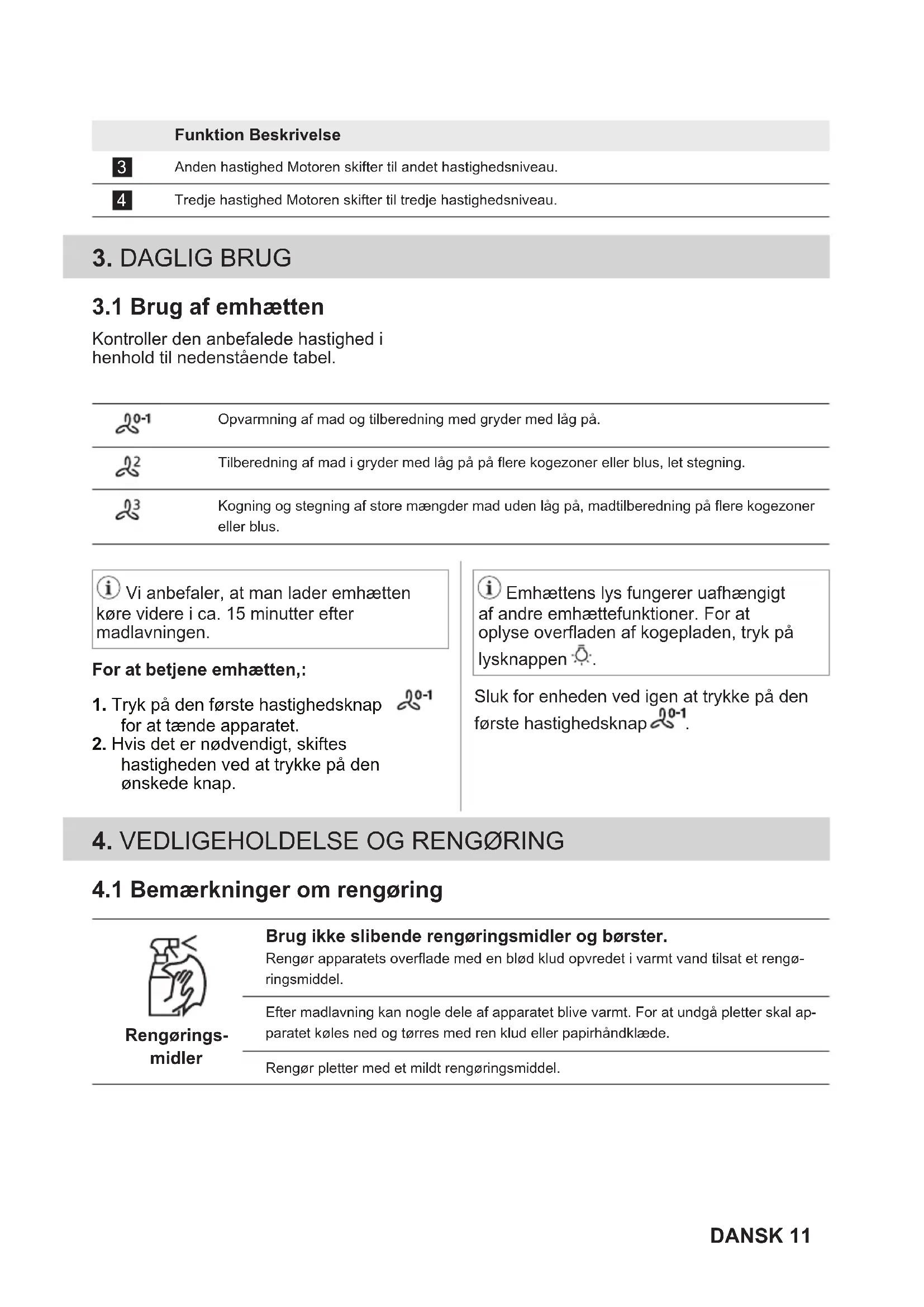 Funktion Beskrivelse Ovnpære Slår lyset til og fra. Første hastighed / slukket Motoren skifter til første hastighedsniveau. Et tryk mere slukker foremhætten. 10 DANSKFunktion Beskrivelse