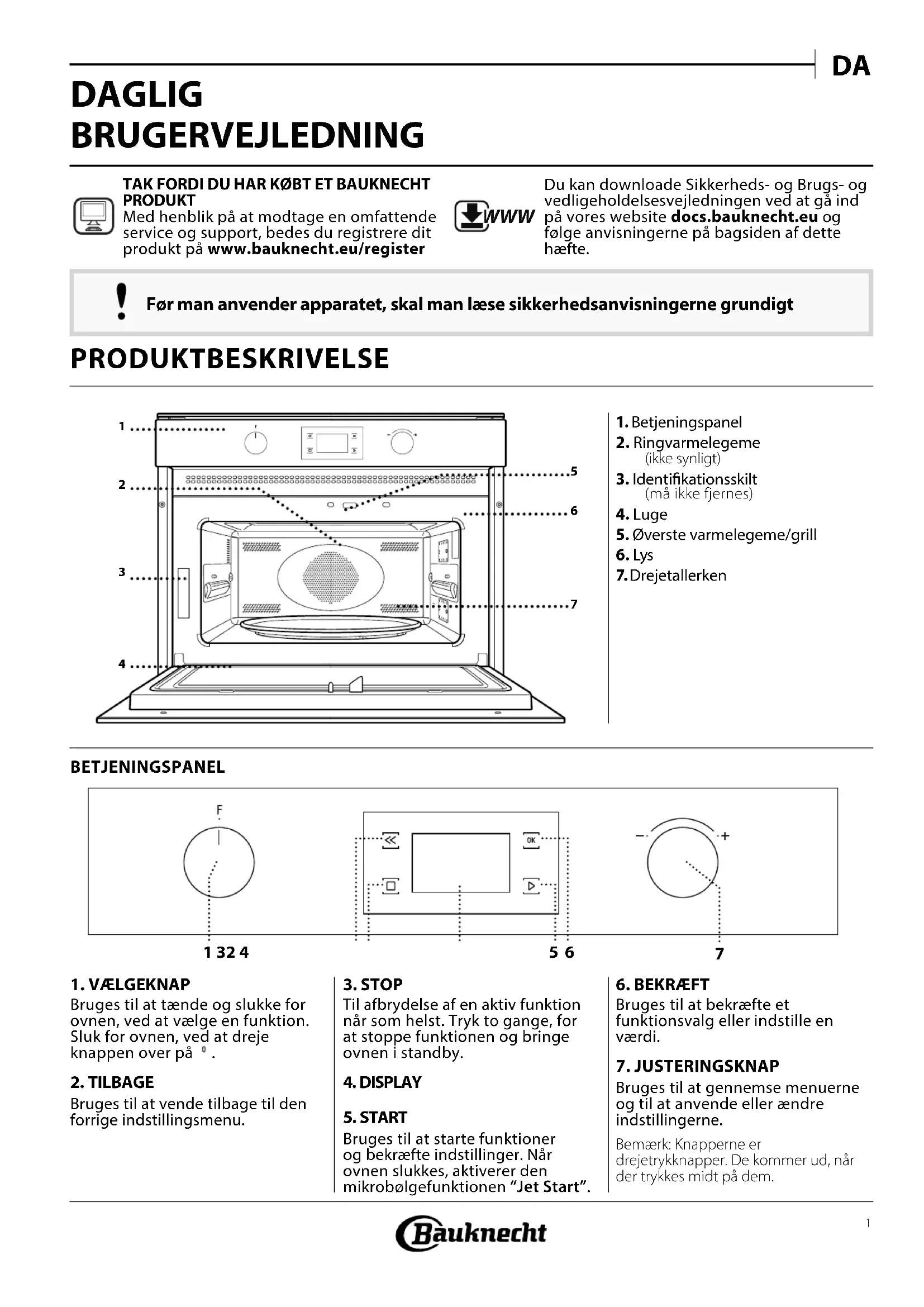 Bruges til at gennemse menuerne og til at anvende eller ændre indstillingerne.Bemærk: Knapperne er drejetrykknapper. De kommer ud, når der trykkes midt på dem.TAK FORDI DU HAR KØBT ET BAUKNECHT PRODUKTMed henblik på at modtage en omfattende service og support, bedes du registrere dit produkt på www.bauknecht.eu/register WWW Du kan downloade Sikkerheds- og Brugs- og vedligeholdelsesvejledningen ved at gå ind på vores website docs.bauknecht.eu og følge anvisningerne på bagsiden af dette hæfte.