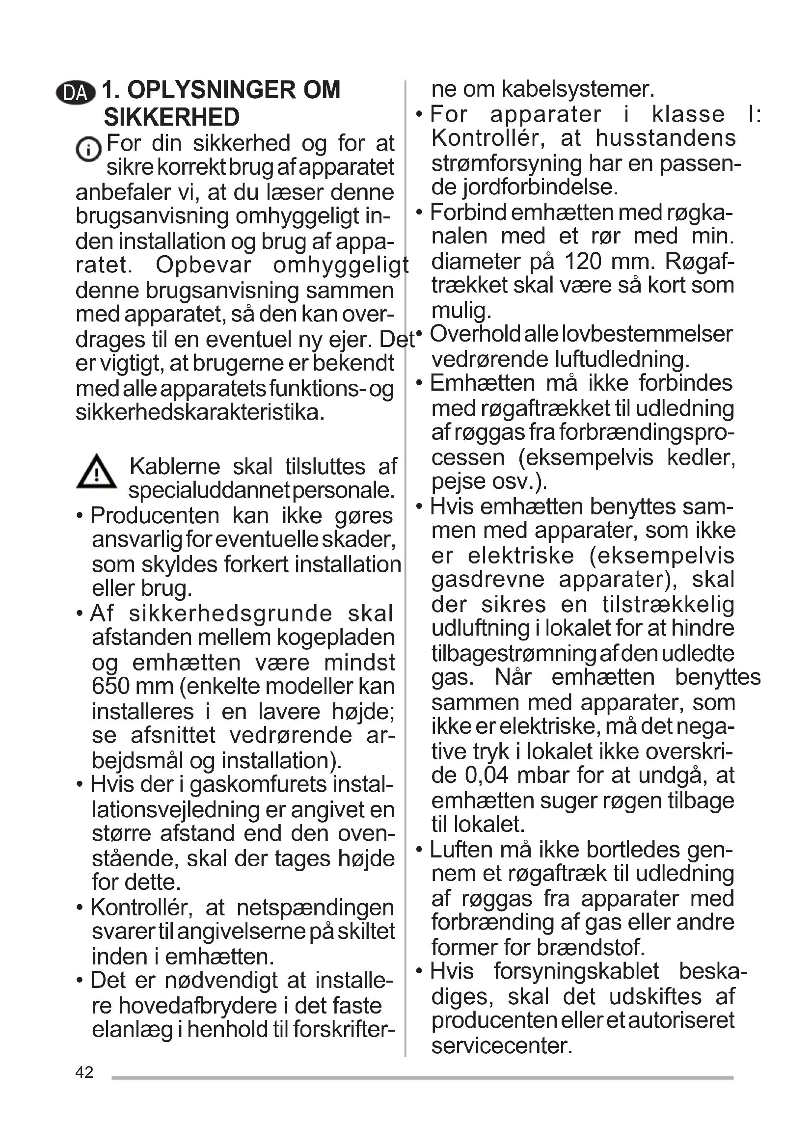 SIKKERHED For din sikkerhed og for at sikre korrekt brug af apparatet anbefaler vi, at du læser denne brugsanvisningomhyggeligtin- den installation og brug af appa- ratet. Opbevar omhyggeligt denne brugsanvisning sammen med apparatet, så den kan over- dragestileneventuelnyejer.Det er vigtigt, at brugerne er bekendt med alle apparatets funktions- og sikkerhedskarakteristika. Kablerne skal tilsluttes af specialuddannet personale.