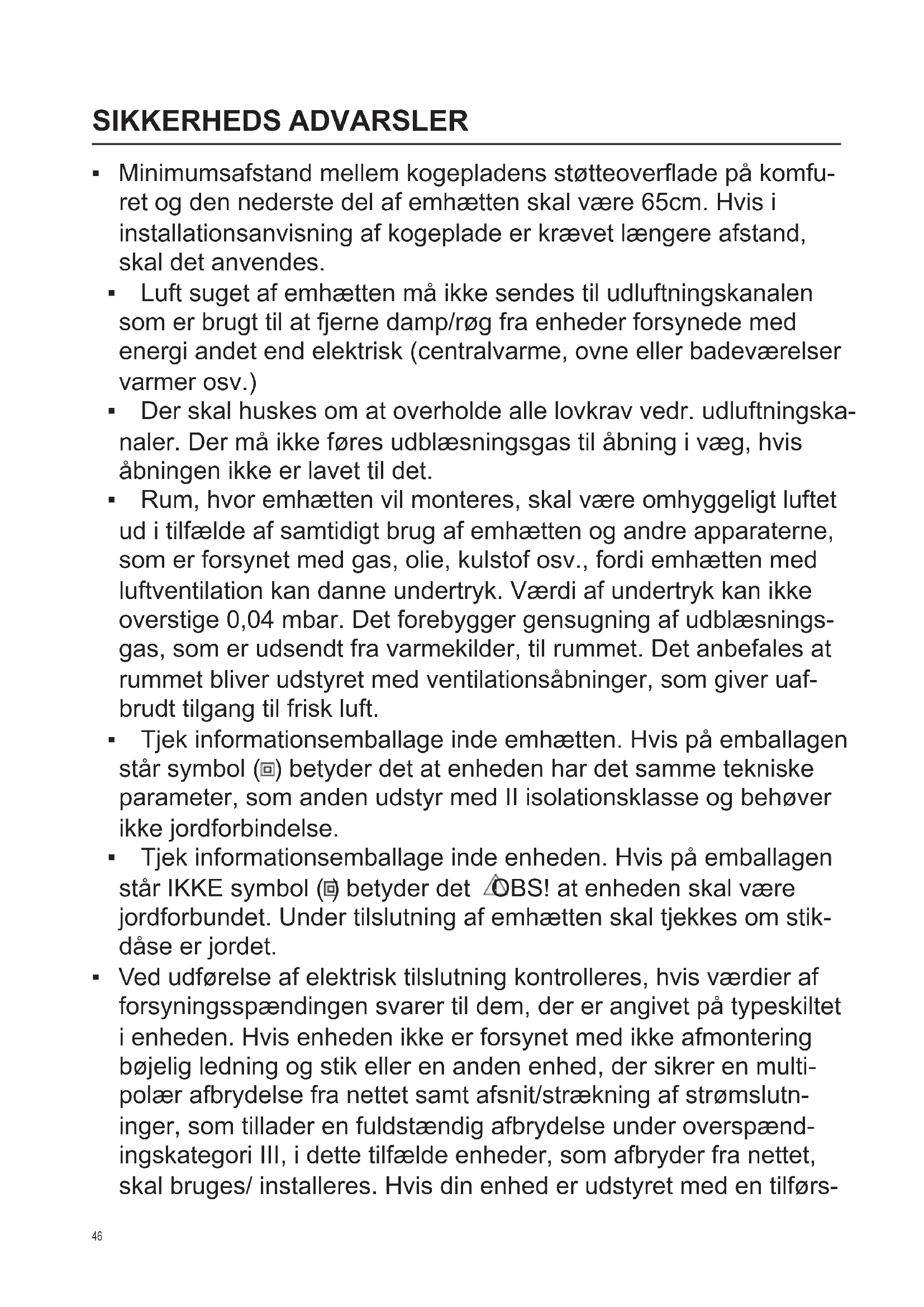 - Tjek informationsemballage inde enheden. Hvis på emballagen står IKKE symbol ( ) betyder det OBS! at enheden skal være jordforbundet. Under tilslutning af emhætten skal tjekkes om stik- dåse er jordet.