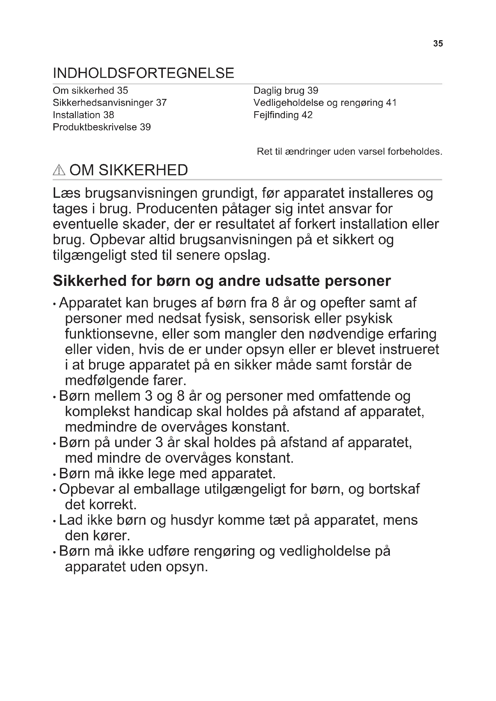 - Børn må ikke udføre rengøring og vedligholdelse på apparatet uden opsyn. 35Generel sikkerhed