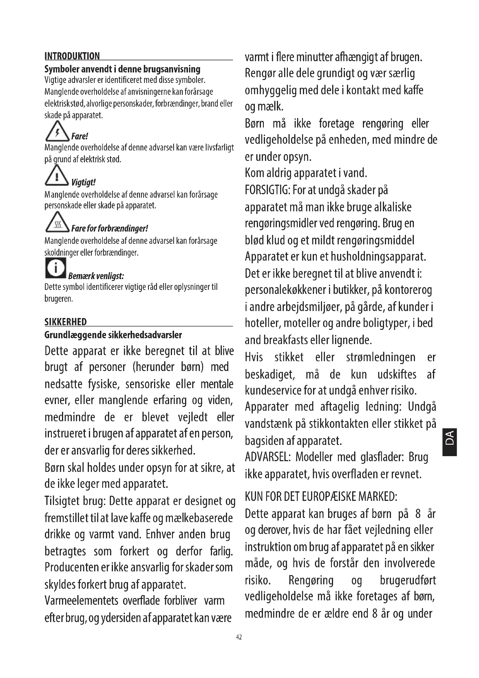 anglende overholdelse af denne advarsel kan forårsage personskade eller skade på apparatet. Fare for forbrændinger! Manglende overholdelse af denne advarsel kan forårsage skoldninger eller forbrændinger. Bemærk venligst: Dette symbol identificerer vigtige råd eller oplysninger til brugeren. SIKKERHED Grundlæggende sikkerhedsadvarsler Dette apparat er ikke beregnet til at blive brugt af personer (herunder børn) med nedsatte fysiske, sensoriske eller mentale evner, eller manglende erfaring og viden, medmindre de er blevet vejledt eller instrueret i brugen af apparatet af en person, der er ansvarlig for deres sikkerhed. Børn skal holdes under opsyn for at sikre, at de ikke leger med apparatet. Tilsigtet brug: Dette apparat er designet og fremstillet til at lave kaffe og mælkebaserede drikke og varmt vand. Enhver anden brug betragtes som forkert og derfor farlig. Producenten er ikke ansvarlig for skader som skyldes forkert brug af apparatet. Varmeelementets overflade forbliver varm efter brug, og ydersiden af apparatet kan være varmt i flere minutter afhængigt af brugen. Rengør alle dele grundigt og vær særlig omhyggelig med dele i kontakt med kaffe og mælk. Børn må ikke foretage rengøring eller vedligeholdelse på enheden, med mindre de er under opsyn. Kom aldrig apparatet i vand. FORSIGTIG: For at undgå skader på apparatet må man ikke bruge alkaliske rengøringsmidler ved rengøring. Brug en blød klud og et mildt rengøringsmiddel Apparatet er kun et husholdningsapparat. Det er ikke beregnet til at blive anvendt i: personalekøkkener i butikker, på kontorer og i andre arbejdsmiljøer, på gårde, af kunder i hoteller, moteller og andre boligtyper, i bed and breakfasts eller lignende. Hvis stikket eller strømledningen er beskadiget, må de kun udskiftes af kundeservice for at undgå enhver risiko. Apparater med aftagelig ledning: Undgå vandstænk på stikkontakten eller stikket på bagsiden af apparatet. ADVARSEL: Modeller med glasflader: Brug ikke apparatet, hvis overfladen er revnet. KUN FOR DET EUROPÆISKE MARKED: Dette apparat kan bruges af børn på 8 år og derover, hvis de har fået vejledning eller instruktion om brug af apparatet på en sikker måde, og hvis de forstår den involverede risiko. Rengøring og brugerudført vedligeholdelse må ikke foretages af børn, medmindre de er ældre end 8 år og under DA43 opsyn. Hold apparatet og dets ledning utilgængeligt for børn under 8 år. Apparatet kan bruges af personer med nedsatte fysiske, sensoriske eller mentale evner, eller manglende erfaring og viden, såfremt de er blevet vejledt eller instrueret i brugen af apparatet på en sikker måde og forstår den involverede risiko. Børn må aldrig lege med apparatet. Tag altid stikket ud af stikkontakten, når apparatet ikke er i brug og inden rengøring. Overflader markeret med dette symbol bliver varme under brug (symbolet findes kun på visse modeller). Fare! Dette er et elektrisk apparat, derfor er det vigtigt at respektere følgende sikkerhedsadvarsler: