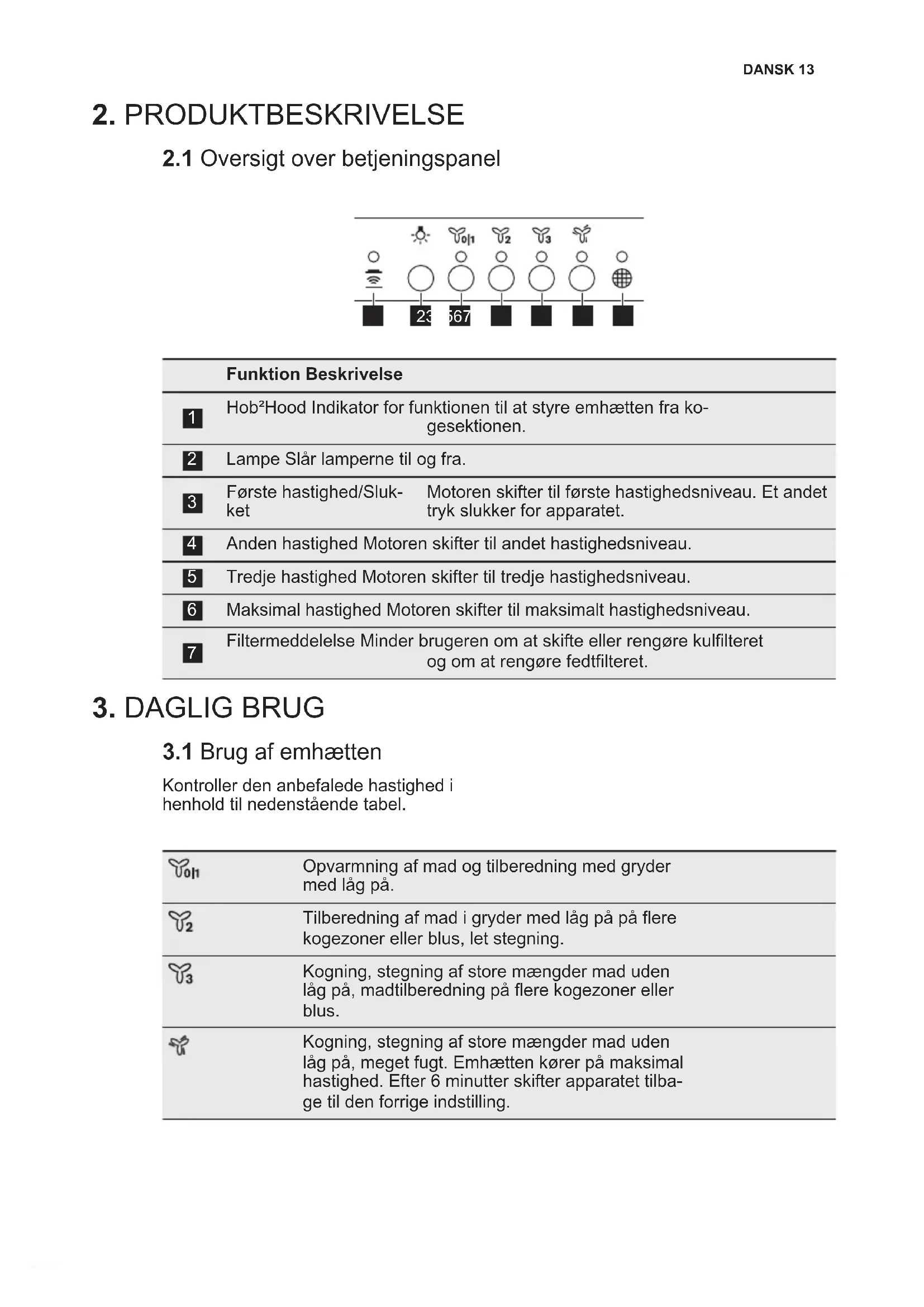 Kontroller den anbefalede hastighed i henhold til nedenstående tabel. Opvarmning af mad og tilberedning med gryder med låg på. Tilberedning af mad i gryder med låg på på flere kogezoner eller blus, let stegning. Kogning, stegning af store mængder mad uden låg på, madtilberedning på flere kogezoner eller blus. Kogning, stegning af store mængder mad uden låg på, meget fugt. Emhætten kører på maksimal hastighed. Efter 6 minutter skifter apparatet tilba‐ ge til den forrige indstilling. DANSK 13Vi anbefaler, at man lader emhætten køre videre i ca. 15 minutter efter madlavningen. For at betjene emhætten: