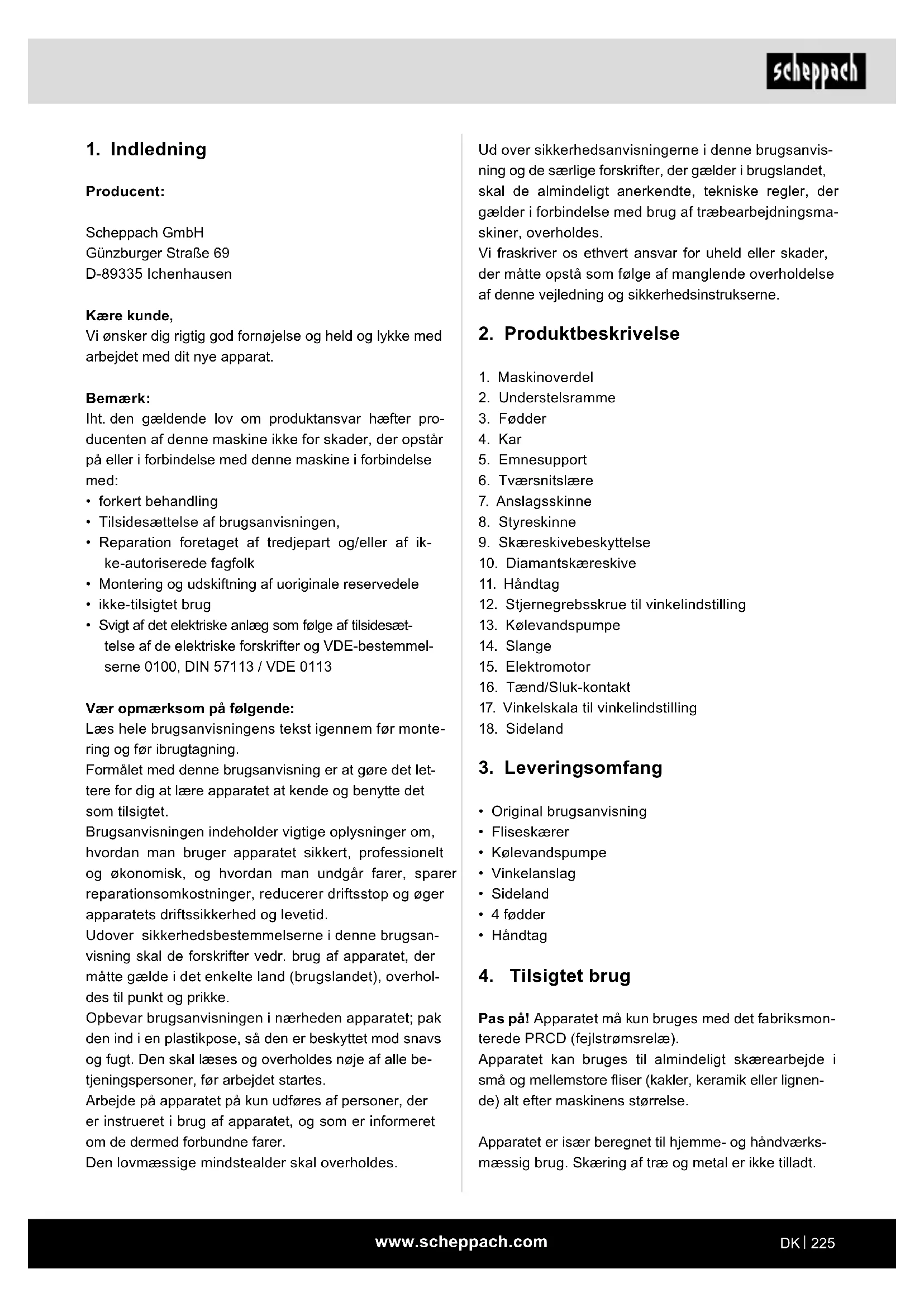Producent: Scheppach GmbH Günzburger Straße 69 D-89335 Ichenhausen Kære kunde, Vi ønsker dig rigtig god fornøjelse og held og lykke med arbejdet med dit nye apparat. Bemærk: Iht. den gældende lov om produktansvar hæfter pro- ducenten af denne maskine ikke for skader, der opstår på eller i forbindelse med denne maskine i forbindelse med: