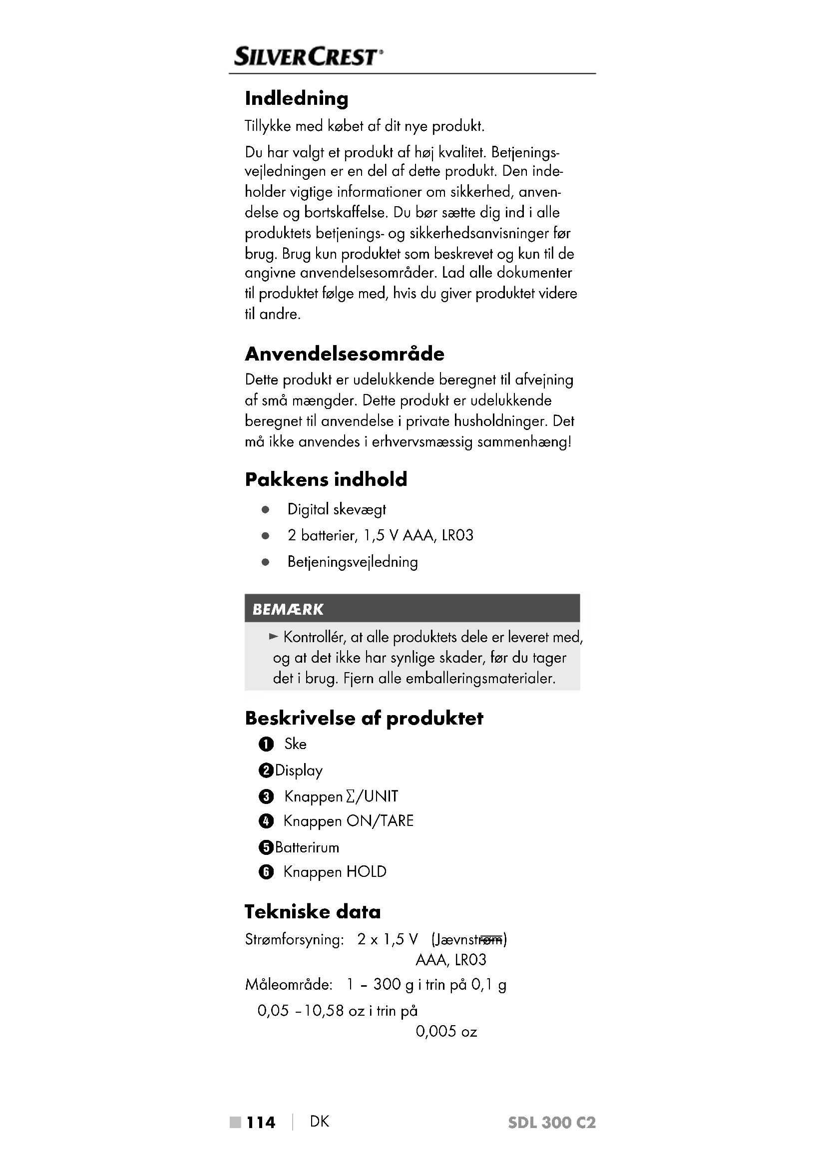 115 ■ Maks. mængde for hver enkelt måling: 300 g / 10,58 oz Maks. mængde sammenlagte målinger: 3000 g / 105,8 oz Målenøjagtighed: 0,1 g / 0,005 oz Alle produktets dele, som kommer i kontakt med levnedsmidler, er levnedsmiddelægte. Sikkerhedsanvisninger Læs betjeningsvejledningen omhyggeligt igennem, før du bruger produktet første gang, og gem vejled- ningen til senere brug. Lad betjeningsvejledningen følge med produktet, hvis du giver det videre til andre. ADVARSEL! FARE FOR KVÆSTELSER! ► Kontrollér produktet for udvendige, synlige skader før brug. Brug ikke produktet, hvis det er beskadiget eller har været tabt på gulvet. ► Dette produkt kan bruges af børn fra 8år og derover og af personer med nedsatte fysiske, motoriske eller mentale evner eller manglende erfaring og/eller viden, hvis de er under opsyn eller undervises i sikker brug af produktet og de farer, der kan være forbundet med det. Børn må ikke lege med produktet. Rengøring og brugervedligeholdel- se må ikke udføres af børn uden opsyn.SDL 300 C2 ■ 116