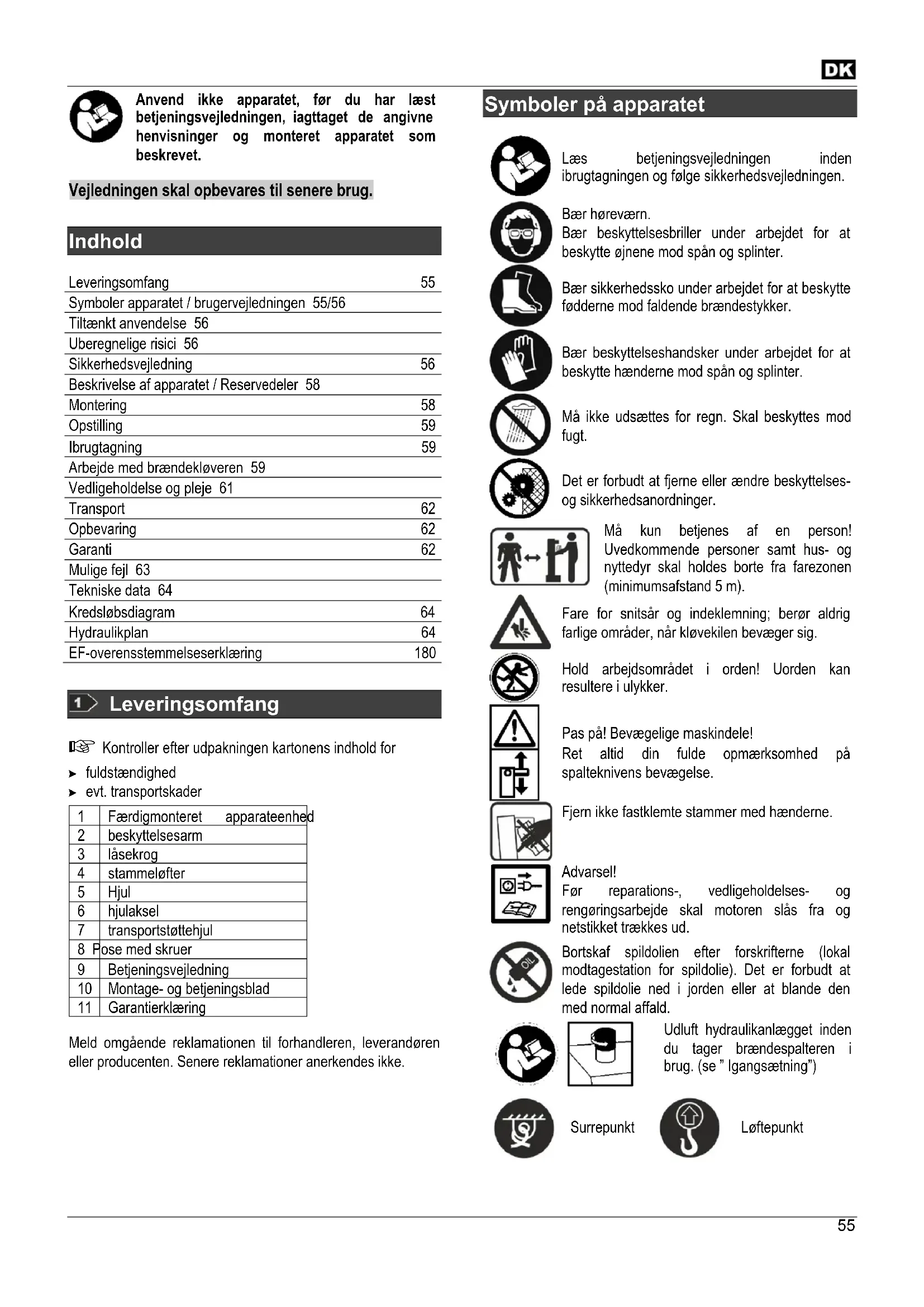 Indhold Leveringsomfang 55 Symboler apparatet / brugervejledningen 55/56 Tiltænkt anvendelse 56 Uberegnelige risici 56 Sikkerhedsvejledning 56 Beskrivelse af apparatet / Reservedeler 58 Montering 58 Opstilling 59 Ibrugtagning 59 Arbejde med brændekløveren 59 Vedligeholdelse og pleje 61 Transport 62 Opbevaring 62 Garanti 62 Mulige fejl 63 Tekniske data 64 Kredsløbsdiagram 64 Hydraulikplan 64 EF-overensstemmelseserklæring 180