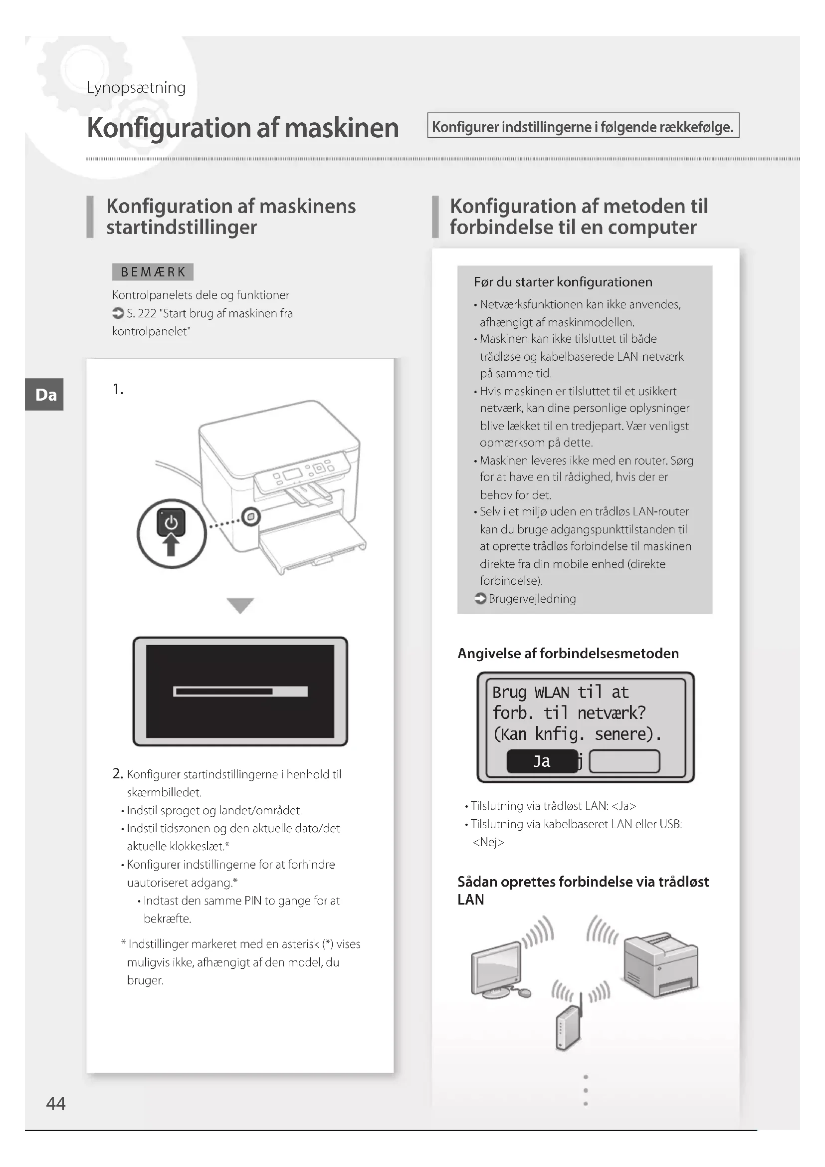 Konfigurer startindstillingerne i henhold til skærmbilledet.• Indstil sproget og landet/området.• Indstil tidszonen og den aktuelle dato/det aktuelle klokkeslæt.*• Konfigurer indstillingerne for at forhindre uautoriseret adgang.*• Indtast den samme PIN to gange for at bekræfte.* Indstillinger markeret med en asterisk (*) vises muligvis ikke, afhængigt af den model, du bruger.Før du starter konfigurationen• Netværksfunktionen kan ikke anvendes, afhængigt af maskinmodellen.• Maskinen kan ikke tilsluttet til både trådløse og kabelbaserede LAN-netværk på samme tid.• Hvis maskinen er tilsluttet til et usikkert netværk, kan dine personlige oplysninger blive lækket til en tredjepart. Vær venligst opmærksom på dette.• Maskinen leveres ikke med en router. Sørg for at have en til rådighed, hvis der er behov for det.• Selv i et miljø uden en trådløs LAN-router kan du bruge adgangspunkttilstanden til at oprette trådløs forbindelse til maskinen direkte fra din mobile enhed (direkte forbindelse). BrugervejledningAngivelse af forbindelsesmetoden Brug WLAN til at forb. til netværk? (Kan knfig. senere). Ja Nej