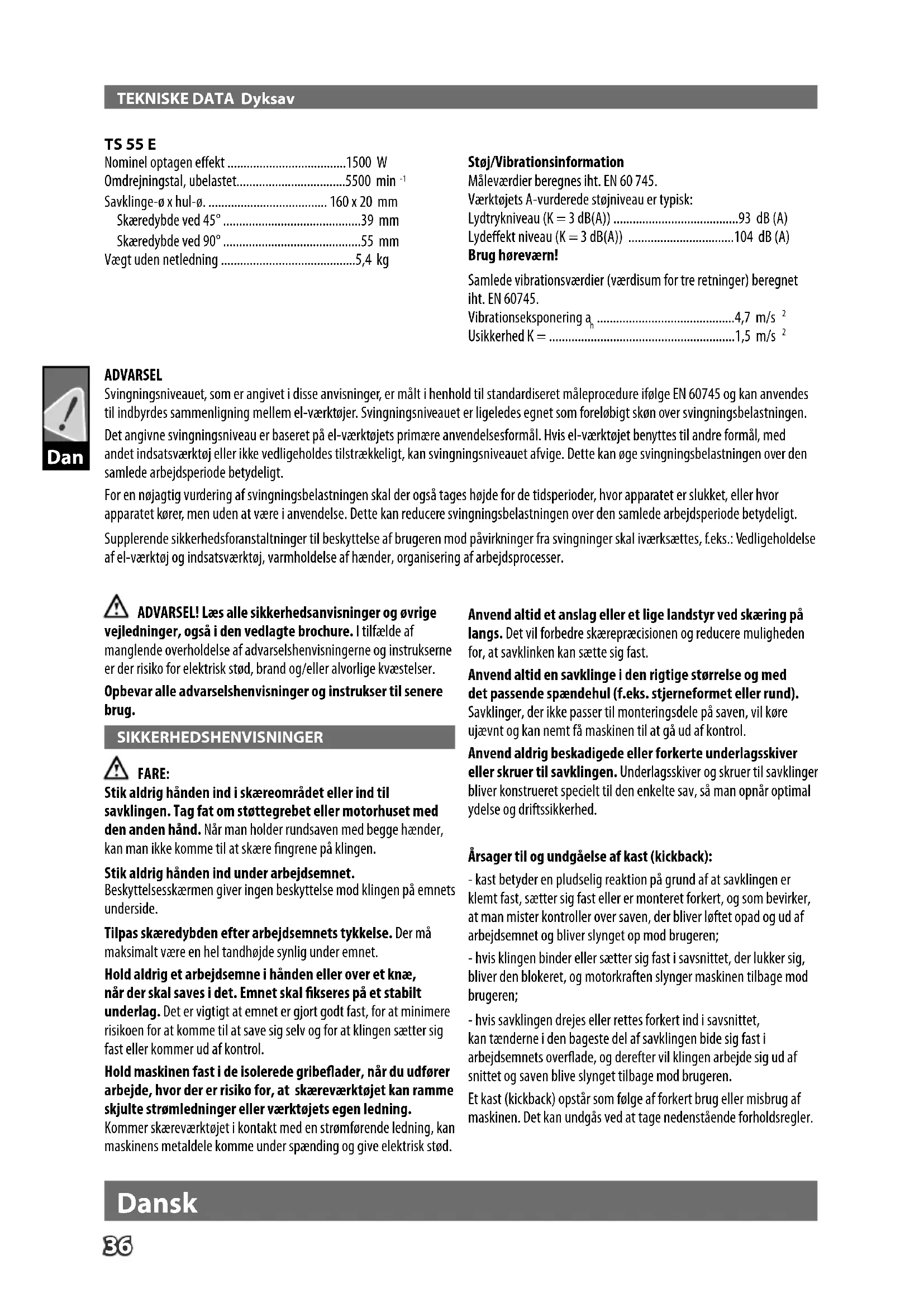 TEKNISKE DATA Dyksav37 Dan Dansk Hold fast på saven med begge hænder og hold armene i en stilling, hvor De kan opfange styrken fra et kast. Stå altid på den ene side af savklingen, savklingen må aldrig stå på linje med kroppen. Ved et kast kan rundsaven springe bagud, men brugeren kan opfange tilbageslagskraften, hvis man forholder sig rigtigt. Hvis savklingen binder eller savningen skal afbrydes af en anden grund, så slip start-/stop-kontakten og lad saven blive siddende i emnet, indtil savklingen står helt stille. Prøv aldrig på at tage saven ud af emnet eller at trække den tilbage, så længe savklingen bevæger sig eller der er risiko for kast. Find ud af, hvorfor savklingen har sat sig fast, og træf egnede forholdsregler, så det ikke kan ske igen. Når man igen vil starte en sav, som har sat sig fast i emnet, skal savklingen centreres i savsnittet, hvorefter man kontrollerer, at savtænderne ikke har sat sig fast i emnet. Hvis savklingen binder, kan den arbejde sig ud af arbejdsemnet og forårsage et kast, når man starter saven igen. Store plader skal afstøttes for at mindske risikoen for kast, på grund af at savklingen sætter sig fast. Store plader har en tendens til at bøje ned i midten på grund af deres egenvægt. Plader skal afstøttes på begge sider, både i nærheden af savsnittet og ved pladens kant. Anvend aldrig en sløv eller beskadiget savklinge. En savklinge med sløve eller forkert rettede tænder giver et smal savsnit, som kan give en for høj friktion, få klingen til at sætte sig fast og forårsage kast. Skæredybden og skærevinklen skal indstilles og spændes fast, før man begynder at save. Hvis indstillingen ændres under savningen, kan savklingen sætte sig fast og der kan opstå kast. Vær især forsigtig, hvis der skal udføres et „dyksnit“ i et uoverskueligt område, f.eks. i en eksisterende væg. Savklingen, der skal dykke ned, kan blive blokeret i skjulte genstande og give kast. Den beskyttelsesskærm funktion Kontroller først, om beskyttelseskappen lukker korrekt, hver gang maskinen skal bruges. Anvend aldrig saven, hvis beskyttelseskappen ikke kan bevæges frit og ikke lukker sig øjeblikkeligt. Den nederste beskyttelseskappe må aldrig klemmes eller bindes fast i åbnet stilling. Hvis saven falder ned ved et uheld, kan den nederste beskyttelseskappe blive bøjet. Overbevis Dem om, at beskyttelseskappen kan bevæges frit og hverken berører savklingen eller andre dele ved alle skærevinkler og -dybder. Kontroller at edrene til beskyttelseskappen er i orden og fungerer korrekt. Få udført service på maskinen, før den bruges igen, hvis beskyttelseskappen og ederen ikke fungerer korrekt. Den nederste beskyttelseskappe kan gå trægt, hvis der er beskadigede dele, klæbrige rester eller større spånaejringer i kappen. Overbevis Dem om før et „dyksnit“, der ikke skal udføres i en ret vinkel, at savens styreplade ikke kan forskyde sig sideværts. En sideværts forskydning kan medføre, at savklingen sætter sig fast, og dermed give kast. Læg aldrig saven fra Dem på et arbejdsbord eller på jorden, uden at beskyttelseskappen dækker savklingen. En ubeskyttet savklinge med efterløb vil få saven til at ytte sig baglæns og vil save i alting, der kommer i vejen for den. Derfor er det vigtigt at holde øje med savens efterløbstid. Spalteknivens funktion Anvend en spaltekniv, der passer til den isatte savklinge. Spaltekniven skal være tykkere end klingens krop, men tyndere en klingens tandbredde. Juster spaltekniven, som beskrevet i betjeningsvejledningen. En forkert tykkelse, position og justering kan være grunden til, at spaltekniven ikke kan forhindre et kast eektivt. Brug altid spaltekniven, også ved „dybdesnit“. Spaltekniven trykkes opad ved neddykningen og edrer efter neddykningen automatisk ind i savspalten, når rundsaven skubbes frem. For at spaltekniven skal kunne virke, skal den sidde i savsnittet. Ved korte snit er spaltekniven uvirksom og kan ikke forhindre et kast. Saven må aldrig bruges, hvis spaltekniven er bøjet. Bare en lille fejl kan få beskyttelseskappen til at lukke sig langsommere. Bær høreværn. Støjpåvirkning kan bevirke tab af hørelse. Brug beskyttelsesudstyr. Bær altid sikkerhedsbriller, når du arbejder med maskinen. Vi anbefaler desuden brug af personlig beskyttelsesudrustning, såsom støvmaske, sikkerhedshandsker, fast og skridsikkert skotøj, hjelm og høreværn. Støv, som opstår i forbindelse med fræsearbejdet, er ofte sundhedsskadeligt (f.eks. ved bearbejdning af ege- og bøgetræ, sten, gamle laklag/lag maling, som indeholder bly eller andre skadelige stoer) og må ikke trænge ind i kroppen. Brug en støvsuger og bær egnet støvbeskyttelsesmaske. Fjern grundigt aejret støv (f.eks. ved opsugning). Før ethvert arbejde ved maskinen skal stikket tages ud af stikdåsen. Maskinen sluttes kun udkoblet til stikdåsen. Tilslutningskablet holdes hele tiden væk fra maskinens arbejdsområde. Kablet ledes altid bort bag om maskinen. Kontroller hvergang, før laderen anvendes, at tilslutningskabel, forlængerkabel og stik er iorden. Dele der er beskadiget bør kun repareres hos et autoriseret værksted. Savklinger, som ikke svarer til data i denne brugsanvisning, må ikke anvendes. Slibeskiver må ikke indsættes Ved bearbejdning af aluminium skal følgende forholdsregler overholdes af sikkerhedsgrunde: - Foretag seriekobling af et fejlstrømsrelæ (FI, RCD, PRCD). - Slut maskinen til en egnet udsugningsenhed. - Maskinen skal med jævne mellemrum renholdes for støvaejringer i motorhuset og i beskyttelseskappen. - Savning i aluminium må kun ske med dertil beregnede specialklinger. - Ved savning i plader skal der smøres med petroleum, tyndvæggede proler (op til 3 mm) kan bearbejdes uden smøring.38 Dan Dansk