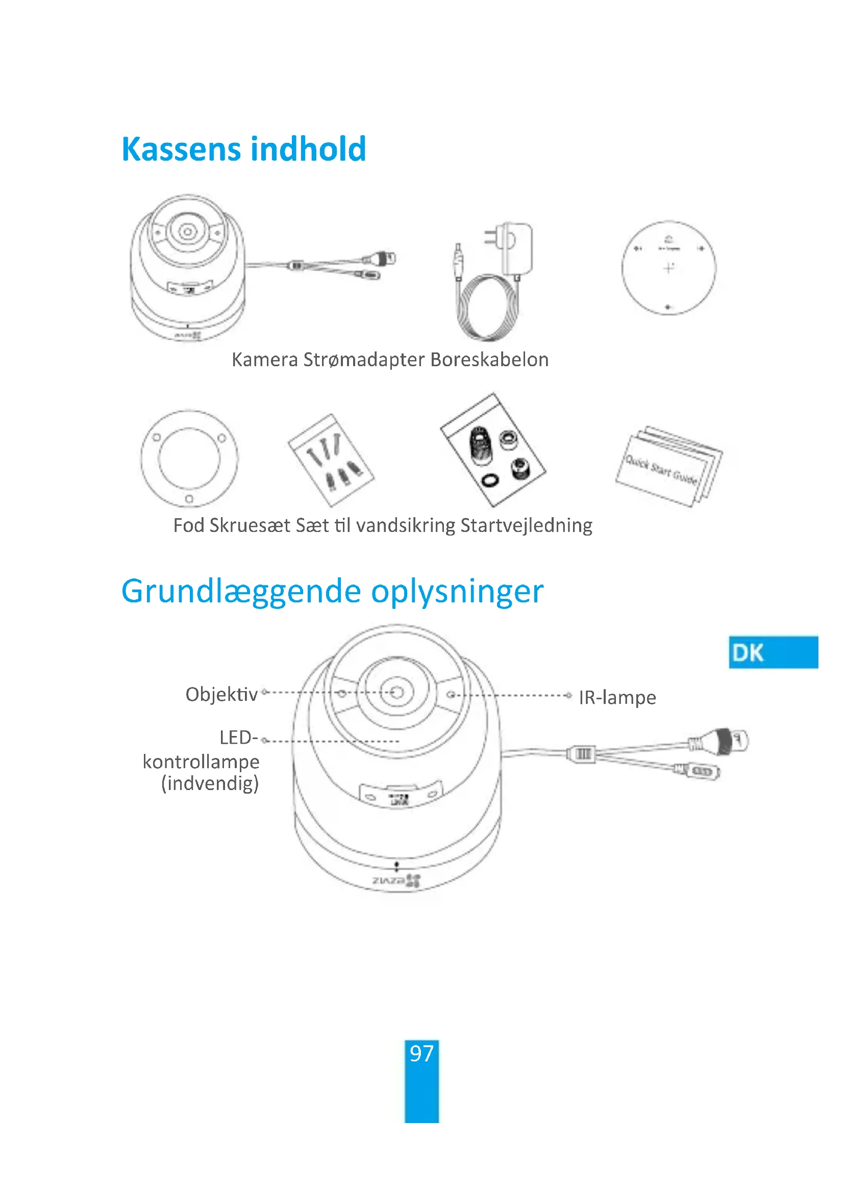 Lossa vredet. Vrid kameran såsom visas på bilden. För detaljerad informaon, gå ll sidan www.ezvizlife.com.97 Kamera Strømadapter Boreskabelon Fod Skruesæt Sæt l vandsikring Startvejledning Grundlæggende oplysninger LED- kontrollampe (indvendig) IR-lampe Objekv Kassens indhold98 Knappen NULSTIL Holder l microSD-kort Netværkssk Strømsk Navn Beskrivelse IR-lampe IR-lampen tænder automask under dårlige lysforhold og gør billedet klarere. LED- kontrollampe