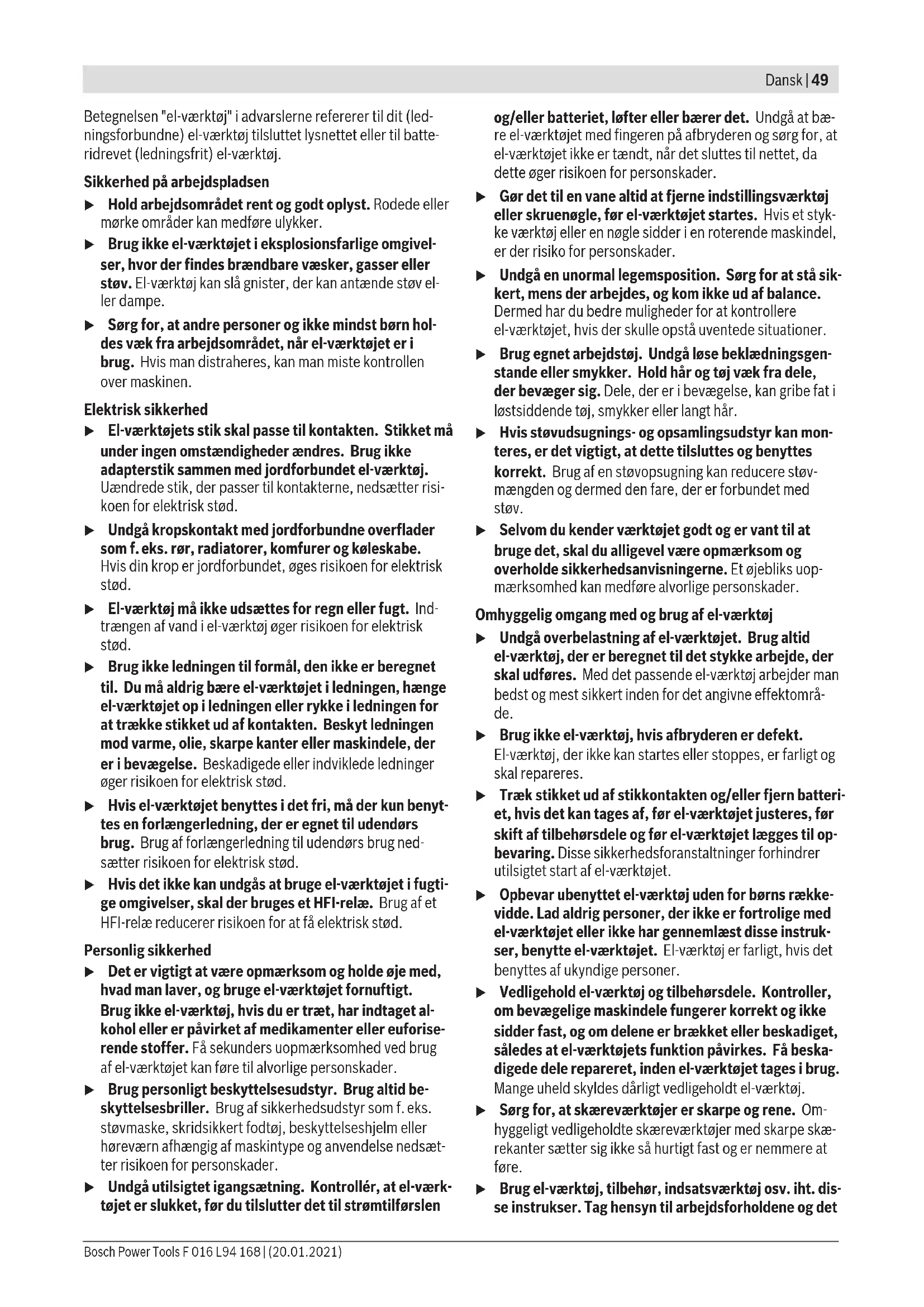 1,5 1,5 1,5 At den/de angivede samlede svingningsværdi/svingnings- værdier og den/de angivede støjemissionsværdi/støjemis- sionsværdier er blevet målt iht. en standardiseret testmeto- de og kan blive brugt til at sammenligne et el-værktøj med et andet. At den/de angivede samlede svingningsværdi/svingnings- værdier og den/de angivede støjemissionsværdi/støjemis- sionsværdier også kan bruges til at foretage en foreløbig vur- dering af belastningen. At svingnings- og støjemissionerne kan afvige fra de angive- de værdier, når el-værktøjet er i brug, afhængigt af hvad el- værktøjet bruges til, især hvilken type emne bearbejdes; og – hvis det er nødvendigt, fastlægges sikkerhedsforanstalt- ninger for at beskytte brugeren, der baserer på en vurdering af svingningsbelastningen under de faktiske brugsbetingel- ser (her skal der tages højde for alle driftscyklussens dele som f.eks. tider, hvor el-værktøjet er slukket, og tider, hvor el-værktøjet godt nok er tændt, men kører uden belastning). Støjemissionsværdier bestemt iht. EN 62841-4-2:2019. El-værktøjets A-vægtede støjniveau er typisk: Lydtryksni- veau 75 dB(A); lydeffektniveau 95 dB(A). Usikkerhed K =2,0dB. Brug høreværn! Samlede vibrationsværdier a
