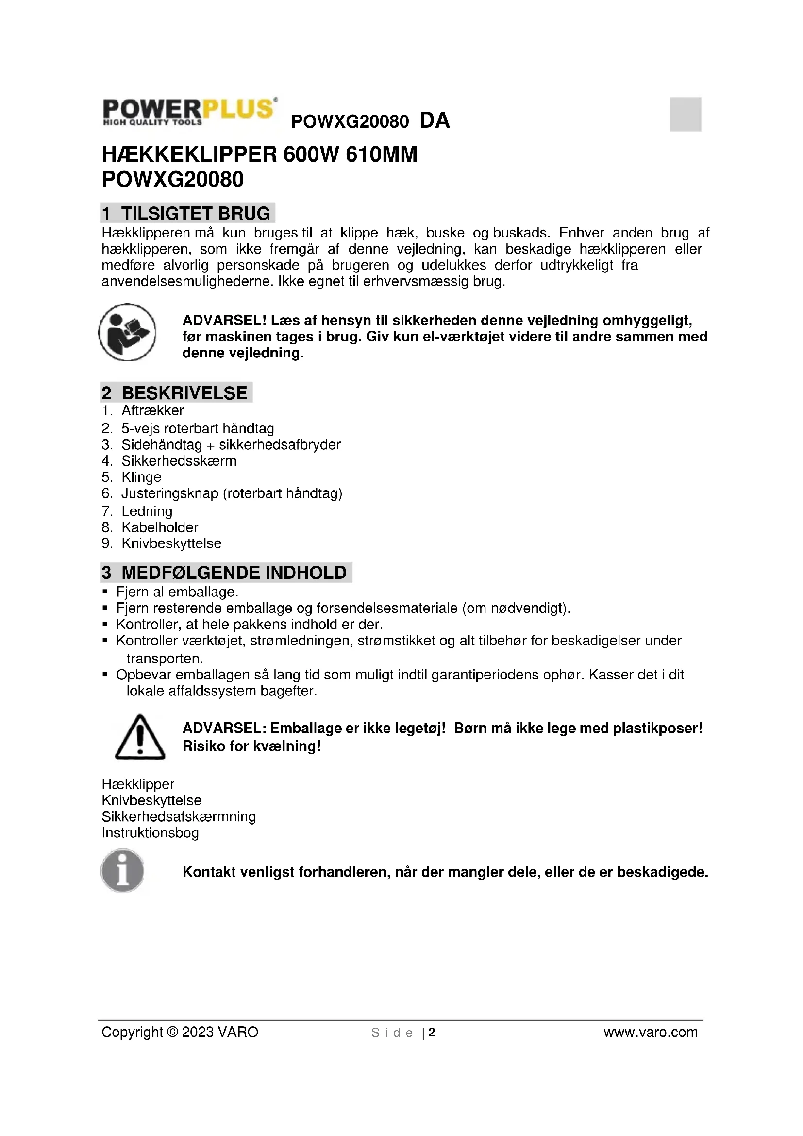 - Opbevar emballagen så lang tid som muligt indtil garantiperiodens ophør. Kasser det i dit lokale affaldssystem bagefter. ADVARSEL: Emballage er ikke legetøj! Børn må ikke lege med plastikposer! Risiko for kvælning! Hækklipper Knivbeskyttelse Sikkerhedsafskærmning Instruktionsbog Kontakt venligst forhandleren, når der mangler dele, eller de er beskadigede.POWXG20080 DA Copyright © 2023 VARO S i d e | 3 www.varo.com 4 SYMBOLER I denne brugervejledning og/eller på maskinen anvendes der følgende piktogrammer: