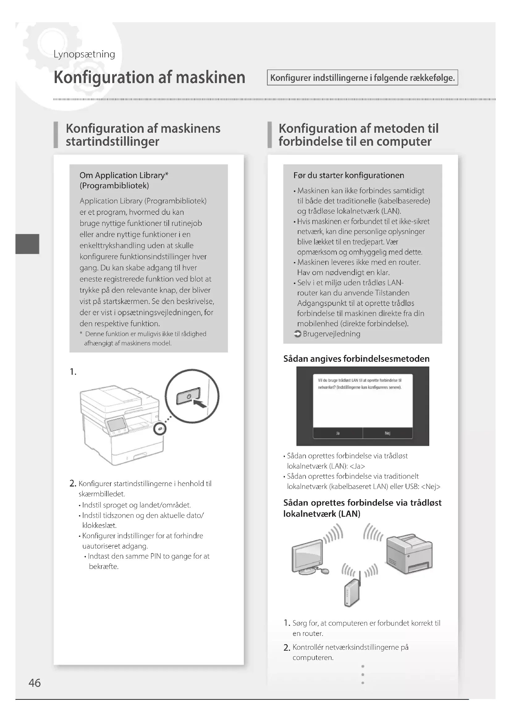 Konfigurer startindstillingerne i henhold til skærmbilledet.• Indstil sproget og landet/området.• Indstil tidszonen og den aktuelle dato/klokkeslæt.• Konfigurer indstillinger for at forhindre uautoriseret adgang.• Indtast den samme PIN to gange for at bekræfte.Før du starter konfigurationen• Maskinen kan ikke forbindes samtidigt til både det traditionelle (kabelbaserede) og trådløse lokalnetværk (LAN). Hvis maskinen er forbundet til et ikke-sikret netværk, kan dine personlige oplysninger blive lækket til en tredjepart. Vær opmærksom og omhyggelig med dette.• Maskinen leveres ikke med en router. Hav om nødvendigt en klar.• Selv i et miljø uden trådløs LAN-router kan du anvende Tilstanden Adgangspunkt til at oprette trådløs forbindelse til maskinen direkte fra din mobilenhed (direkte forbindelse). BrugervejledningSådan angives forbindelsesmetoden• Sådan oprettes forbindelse via trådløst lokalnetværk (LAN): <Ja>• Sådan oprettes forbindelse via traditionelt lokalnetværk (kabelbaseret LAN) eller USB: <Nej>Sådan oprettes forbindelse via trådløst lokalnetværk (LAN) Sørg for, at computeren er forbundet korrekt til en router. Kontrollér netværksindstillingerne på computeren.