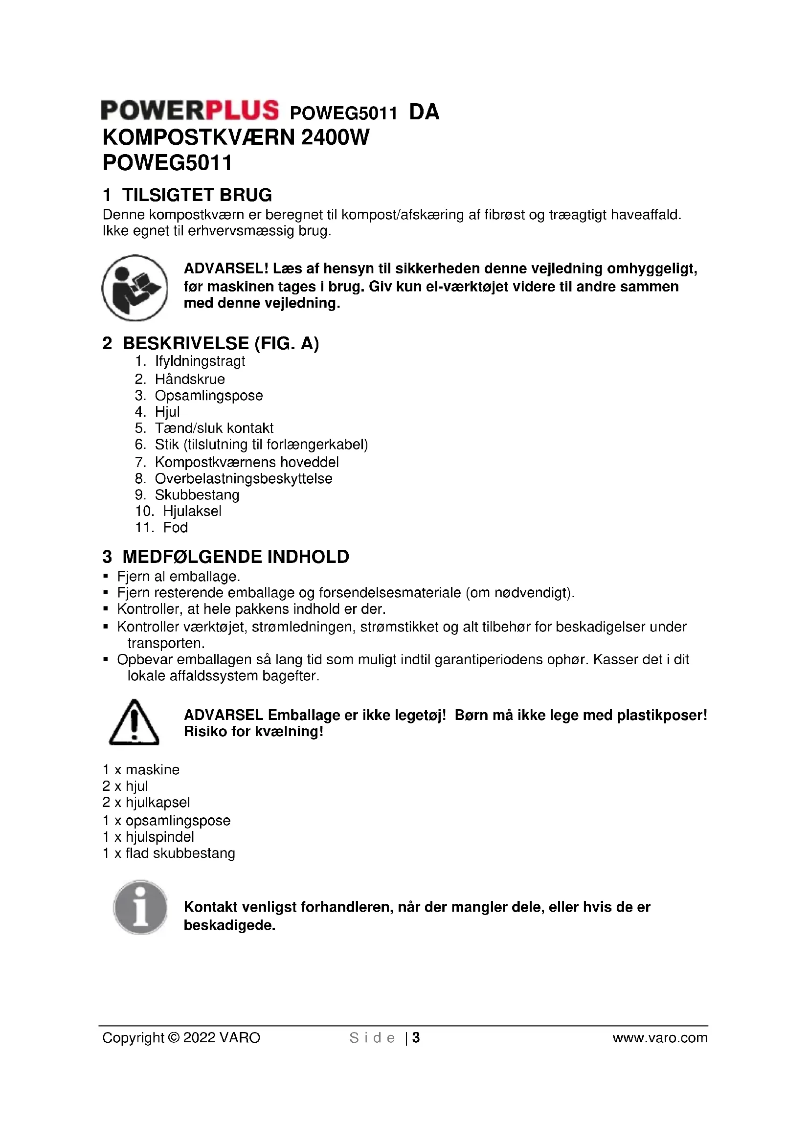 - Ved tilførsel af materiale i maskinen skal man være meget omhyggelig med ikke at medtage metalstykker, sten, flasker, dåser eller andet fremmemateriale.POWEG5011 DA Copyright © 2022 VARO S i d e | 8 www.varo.com