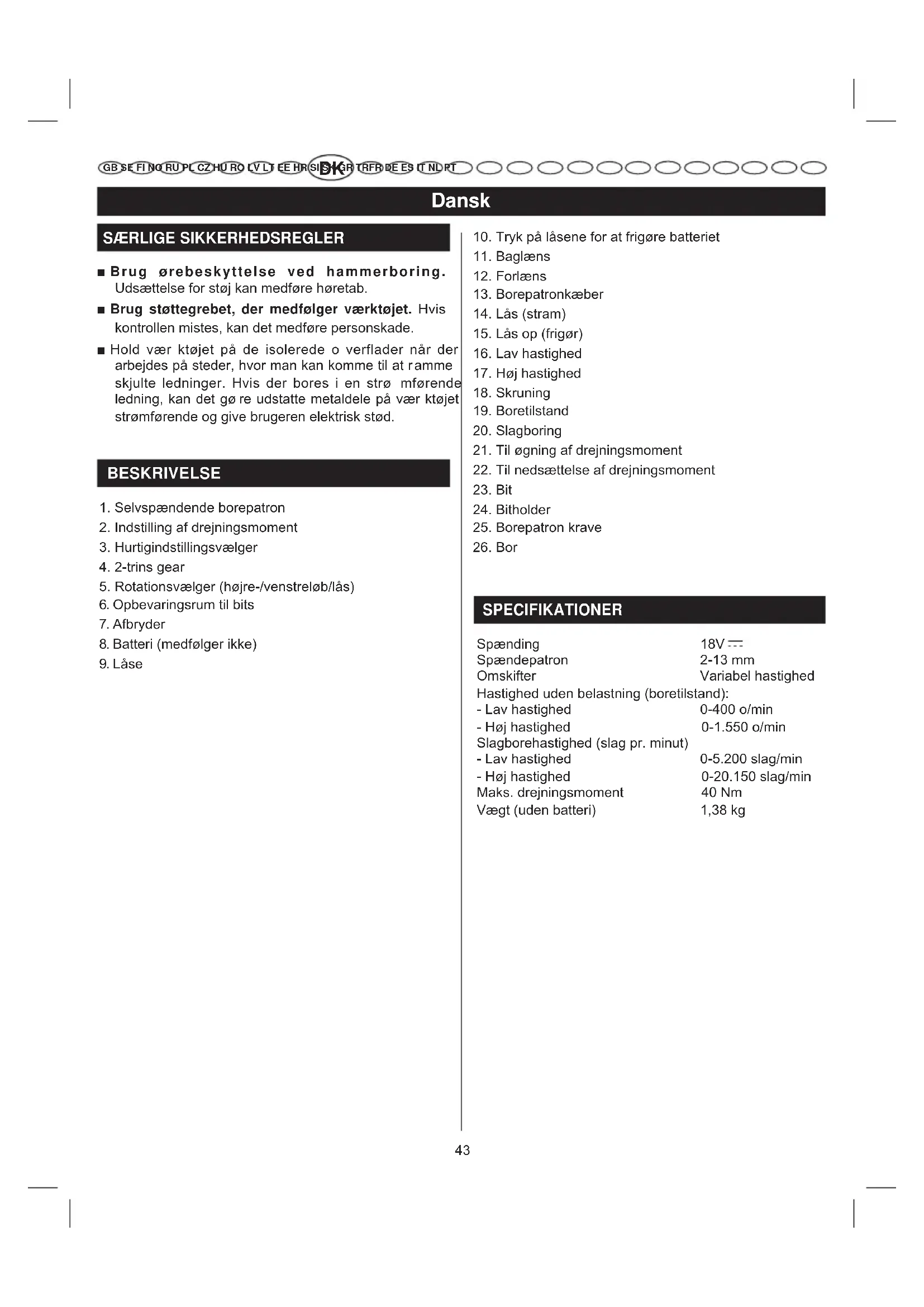 SPECIFIKATIONER Spænding 18V Spændepatron 2-13 mm Omskifter Variabel hastighed Hastighed uden belastning (boretilstand): - Lav hastighed 0-400 o/min - Høj hastighed 0-1.550 o/min Slagborehastighed (slag pr. minut) - Lav hastighed 0-5.200 slag/min - Høj hastighed 0-20.150 slag/min Maks. drejningsmoment 40 Nm Vægt (uden batteri) 1,38 kg44 Dansk