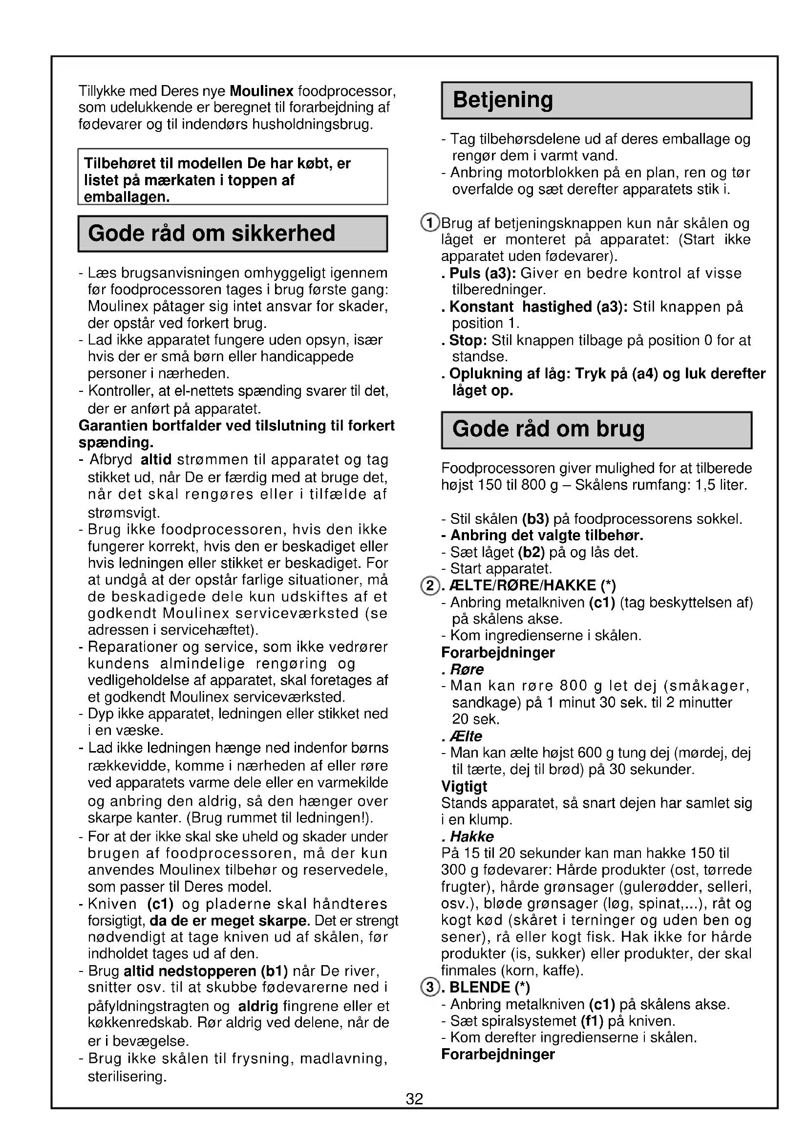 delicio EU11.PM6 20/02/06, 15:373233 - Man kan tilberede højst 0,8 liter suppe, sovs, læskedrik, dej til pandekager, æblekager. Vigtigt: - Hæld aldrig kogende væsker ned i skålen. - Brug ikke apparatet i mere end 2 minutter. . PISKE/EMULGERE (*) - Før drevet (d1) ned på foodprocessorens centrale akse. - Sæt emulgeringspladen (e1) i og drej den, indtil den er i spærret position. - Kom derefter ingredienserne i skålen. Forarbejdninger - Man kan piske 1 til 4 æggehvider og op til 0,2 liter piskefløde. Vigtigt: Brug aldrig emulgeringspladen (e1) til at ælte tung dej eller røre let dej. Brug ikke apparatet i mere end 4 minutter. . RIVE/SNITTE (*) - Glid bladet (C, H, A, E) ind i holderen (d2). - Sæt drevet (d1) på pladens midte, således at spidsen kommer op gennem bladets hul i midten. - Drej drevet (d1) en kvart omgang for at spærre den på pladen. - Gå frem i modsat rækkefølge for at afmontere: Bladet kan kun tages af, når drevet er fjernet. - Sæt helheden på skålens centrale akse. - Kom ingredienserne ned i påfyldningstragten (b1) med nedstopperen og aldrig med fingrene eller et redskab. Forarbejdninger . Blad C (grov rivning): Gulerødder, gruyere, selleri... . Blad H (tykke skiver): Kartofler til kartoffelgratin, gulerødder, agurker... . Blad A (fin rivning): Gulerødder, gruyere, selleri...(*) . Blad E (pommes frites): Kartofler til pommes frites, … (*) - Forarbejd højst 500 g fødevarer på én gang (ikke kød og ikke pålægsvarer). . PRESSE CITRUSFRUGTER (*) - Sæt filterkurven (h1) på skålen og drej den, indtil den er i spærret position. - Sæt drevet (h2) på den centrale akse. - Anbring keglen i sit hus på filterkurven. - Skær citrusfrugterne over i halve. - Sæt en halv citrusfrugt på keglen og tryk på den. Forarbejdninger - Man kan presse højst 0,8 liter frugtsaft uden at tømme skålen. - Filterkurven (h1) skal skylles, når der er presset 0,5 liter. . PRESSE FRUGTER OG GRØNSAGER (*) - Anbring den filtrerende rand (i3) i filterholderen (i5). - Sæt kraven (i4) på filterholderen (i5). Denne krave fastholder den filtrerende rand. - Sæt den samlede filterholder (i3+i4+i5) på skålens drev. - Sæt låget (i2) på skålen og lås den. - Kom fødevarerne ned i påfyldningstragten. - Tryk fødevarerne ned med nedstopperen (i1) - aldrig med fingrene. Forberedelse af frugter - Vask frugterne og skær dem i terninger, hvis det er nødvendigt. - Tag stenen ud af blommer, ferskner, abrikoser, kirsebær og selleriblade. - Tag skindet af citrusfrugter, meloner (tag også kerner ud) og ananas. Vigtigt: - Brug ikke apparatet, hvis saftpresserens filterholder er beskadiget. - Pres små mængder og rengør filtret ofte for at få det bedste resultat. - Overskrid ikke 250 g ingredienser. - Brug ikke apparatet i mere end 1 minut 30 sekunder. (*): afhængig af model Rengøring - Tag apparatets stik ud og afmonter tilbehørsdelene. - Vask, skyl og tør tilbehørsdelene af (de kan stilles i opvaskemaskine). - Brug ikke skuresvampe eller genstande, som indeholder metal. - Dyp aldrig motorblokken (a1) ned i vand. Tør den af med en tør eller let fugtig klud. - Hvis tilbehørsdelene er blevet misfarvet af fødevarerne (gulerødder, appelsiner... ) skal de blot tørres af med en klud vædet med spiseolie, før de rengøres på normal vis. - Kniven (c1) og pladerne H og E skal håndteres forsigtigt; de er meget skarpe. Hvis foodprocessoren ikke virker? - Kontroller først den elektriske tilslutning og dernæst: - om skålen (b3) sidder korrekt, om låget (b2) er låst fast, om tilbehørsdelene er sat rigtigt i og om betjeningsknappen (a3) er i den rigtige position. Hvis disse instruktioner ikke overholdes, kan foodprocessoren ikke starte. Hvis De har fulgt alle disse instruktioner omhyggeligt og Deres apparat stadig ikke virker, skal De henvende Dem til et godkendt Moulinex serviceværksted (se adressen i Moulinex servicehæftet).