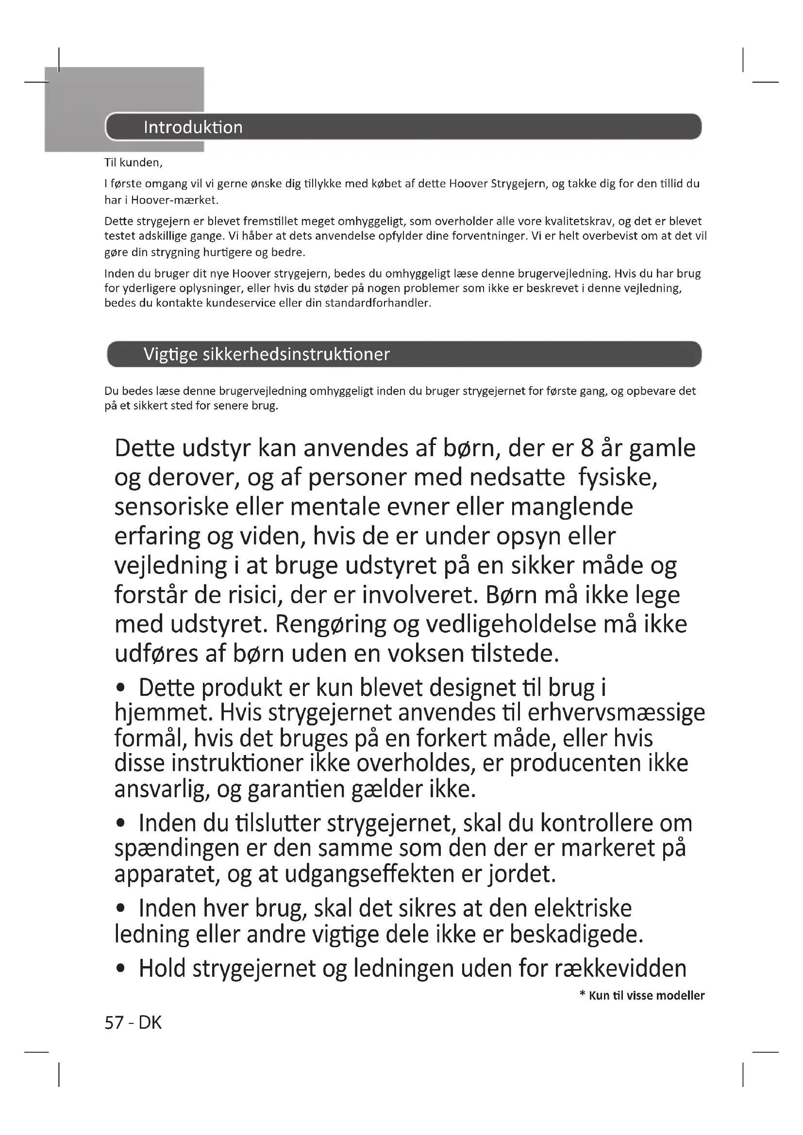 - Kun l visse modeller Introdukon Til kunden, I første omgang vil vi gerne ønske dig llykke med købet af dee Hoover Strygejern, og takke dig for den llid du har i Hoover-mærket. Dee strygejern er blevet fremsllet meget omhyggeligt, som overholder alle vore kvalitetskrav, og det er blevet testet adskillige gange. Vi håber at dets anvendelse opfylder dine forventninger. Vi er helt overbevist om at det vil gøre din strygning hurgere og bedre. Inden du bruger dit nye Hoover strygejern, bedes du omhyggeligt læse denne brugervejledning. Hvis du har brug for yderligere oplysninger, eller hvis du støder på nogen problemer som ikke er beskrevet i denne vejledning, bedes du kontakte kundeservice eller din standardforhandler. Vigge sikkerhedsinstrukoner Du bedes læse denne brugervejledning omhyggeligt inden du bruger strygejernet for første gang, og opbevare det på et sikkert sted for senere brug. Dee udstyr kan anvendes af børn, der er 8 år gamle og derover, og af personer med nedsae fysiske, sensoriske eller mentale evner eller manglende erfaring og viden, hvis de er under opsyn eller vejledning i at bruge udstyret på en sikker måde og forstår de risici, der er involveret. Børn må ikke lege med udstyret. Rengøring og vedligeholdelse må ikke udføres af børn uden en voksen lstede.