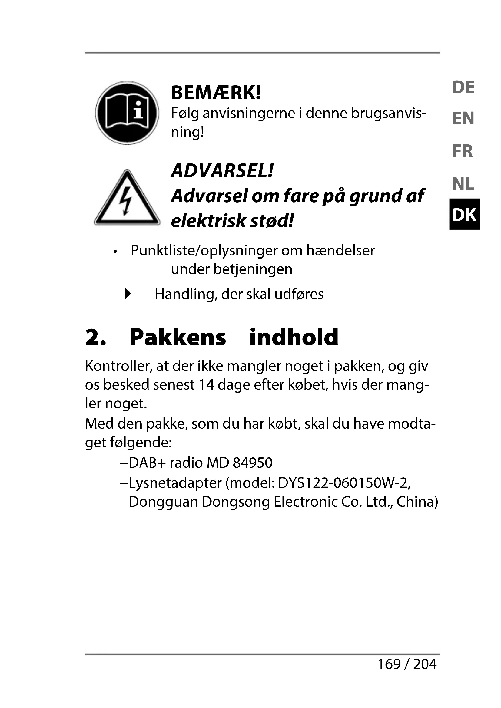 Kontroller, at der ikke mangler noget i pakken, og giv os besked senest 14 dage efter købet, hvis der mang- ler noget. Med den pakke, som du har købt, skal du have modta- get følgende: − DAB+ radio MD 84950 − Lysnetadapter (model: DYS122-060150W-2, Dongguan Dongsong Electronic Co. Ltd., China) 84950 eComm ML Content Final REV7.indb 16984950 eComm ML Content Final REV7.indb 169 26.05.2015 10:45:2626.05.2015 10:45:26170 / 204