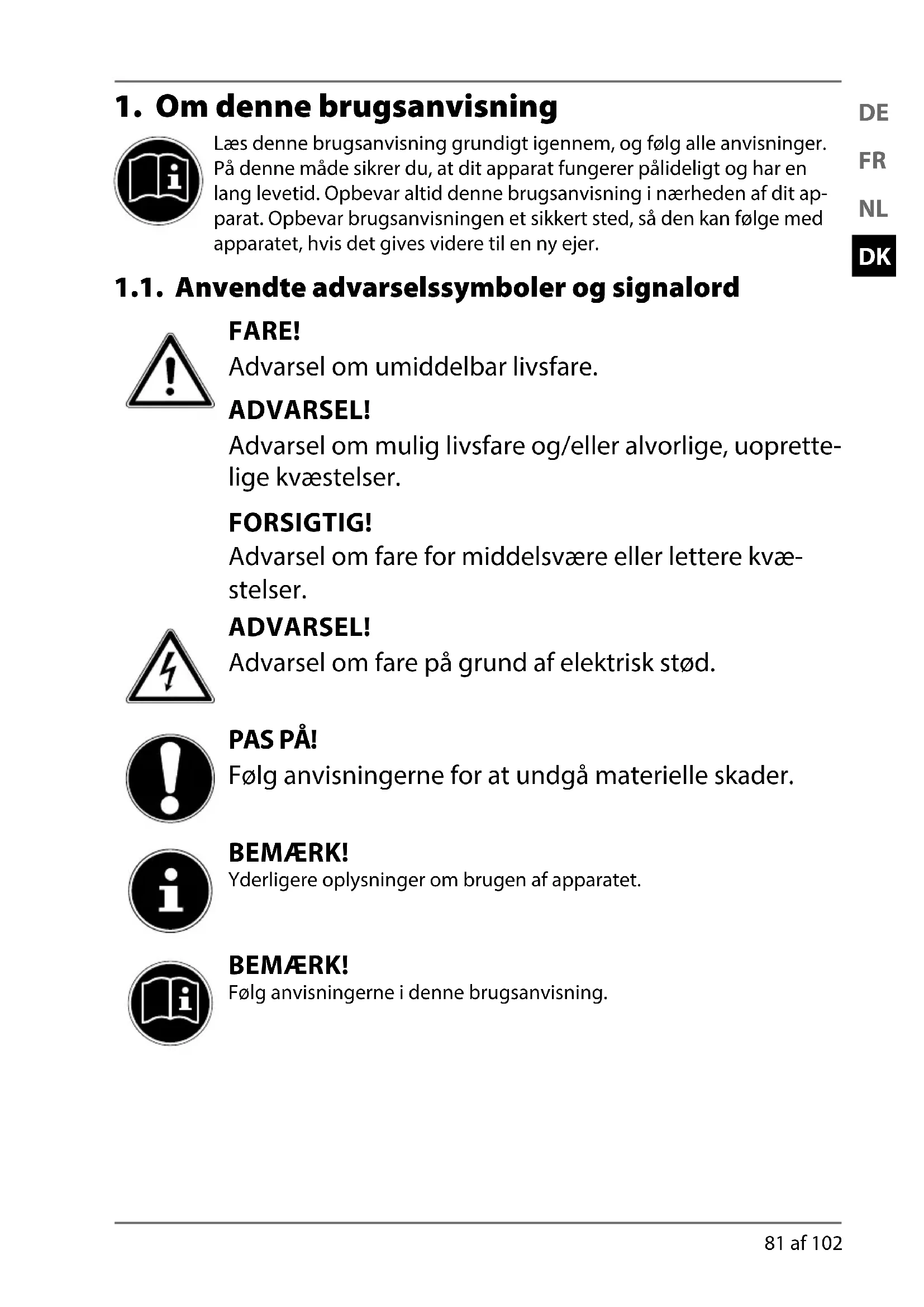 Læs denne brugsanvisning grundigt igennem, og følg alle anvisninger. På denne måde sikrer du, at dit apparat fungerer pålideligt og har en lang levetid. Opbevar altid denne brugsanvisning i nærheden af dit ap- parat. Opbevar brugsanvisningen et sikkert sted, så den kan følge med apparatet, hvis det gives videre til en ny ejer. 1.1. Anvendte advarselssymboler og signalord FARE! Advarsel om umiddelbar livsfare. ADVARSEL! Advarsel om mulig livsfare og/eller alvorlige, uoprette- lige kvæstelser. FORSIGTIG! Advarsel om fare for middelsvære eller lettere kvæ- stelser. ADVARSEL! Advarsel om fare på grund af elektrisk stød. PAS PÅ! Følg anvisningerne for at undgå materielle skader. BEMÆRK! Yderligere oplysninger om brugen af apparatet. BEMÆRK! Følg anvisningerne i denne brugsanvisning. 80025 DE-FR-NL-DK eCommerce Content RC1.indb 8180025 DE-FR-NL-DK eCommerce Content RC1.indb 81 29.09.2015 10:01:2229.09.2015 10:01:2282 af 102