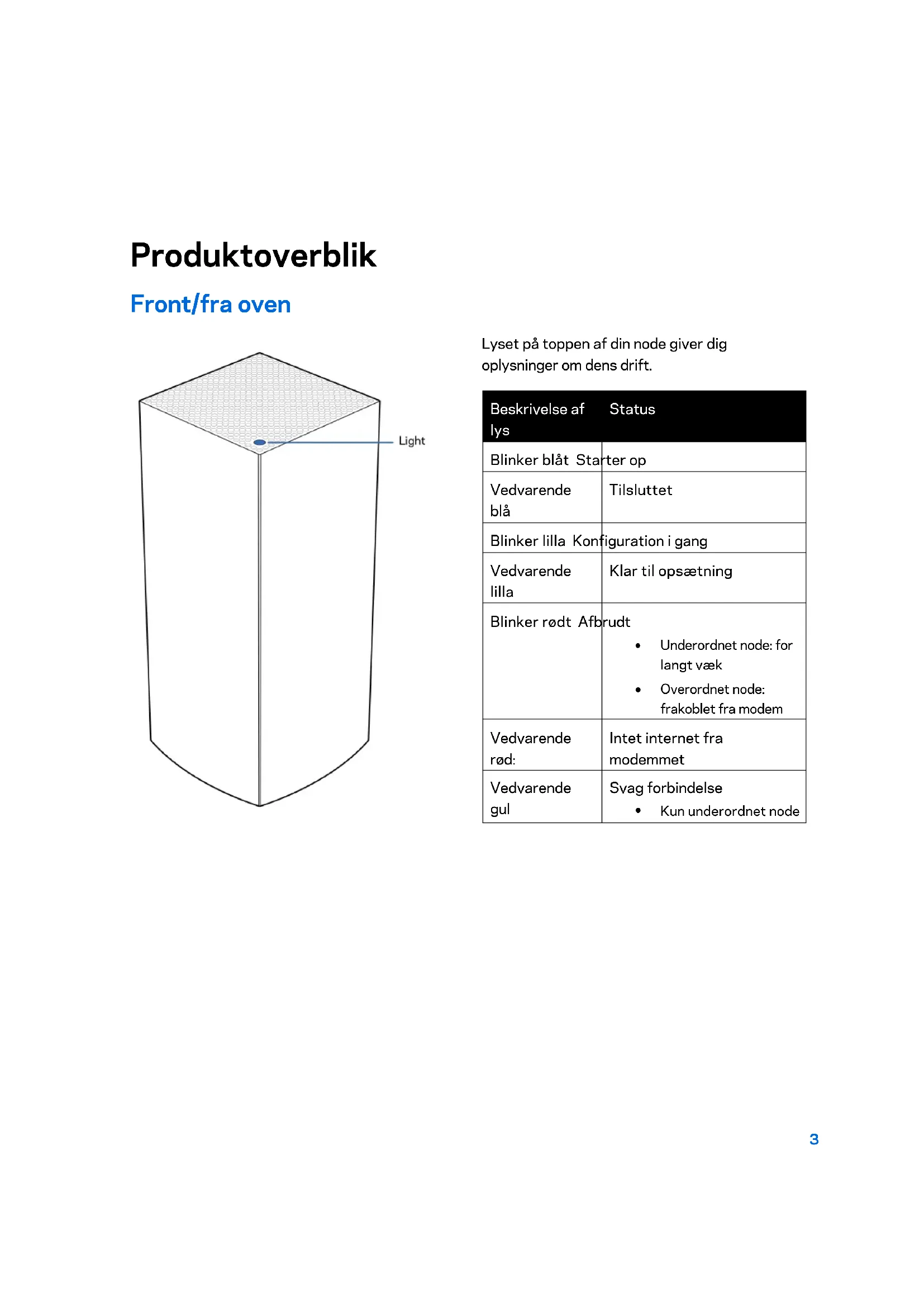 Nulstillingsknap—Tryk og hold nede, indtil lyset foran på noden bliver rødt, falmer og blinker rødt igen for at nulstille noden til dens fabriksindstillinger. Wi-Fi Protected Setup™-knap—Tryk for at oprette forbindelse til WPS-kompatible netværksenheder. Strømknap—Før til | (on) for at tænde routeren.6 Hjælp Hvor finder jeg mere hjælp?