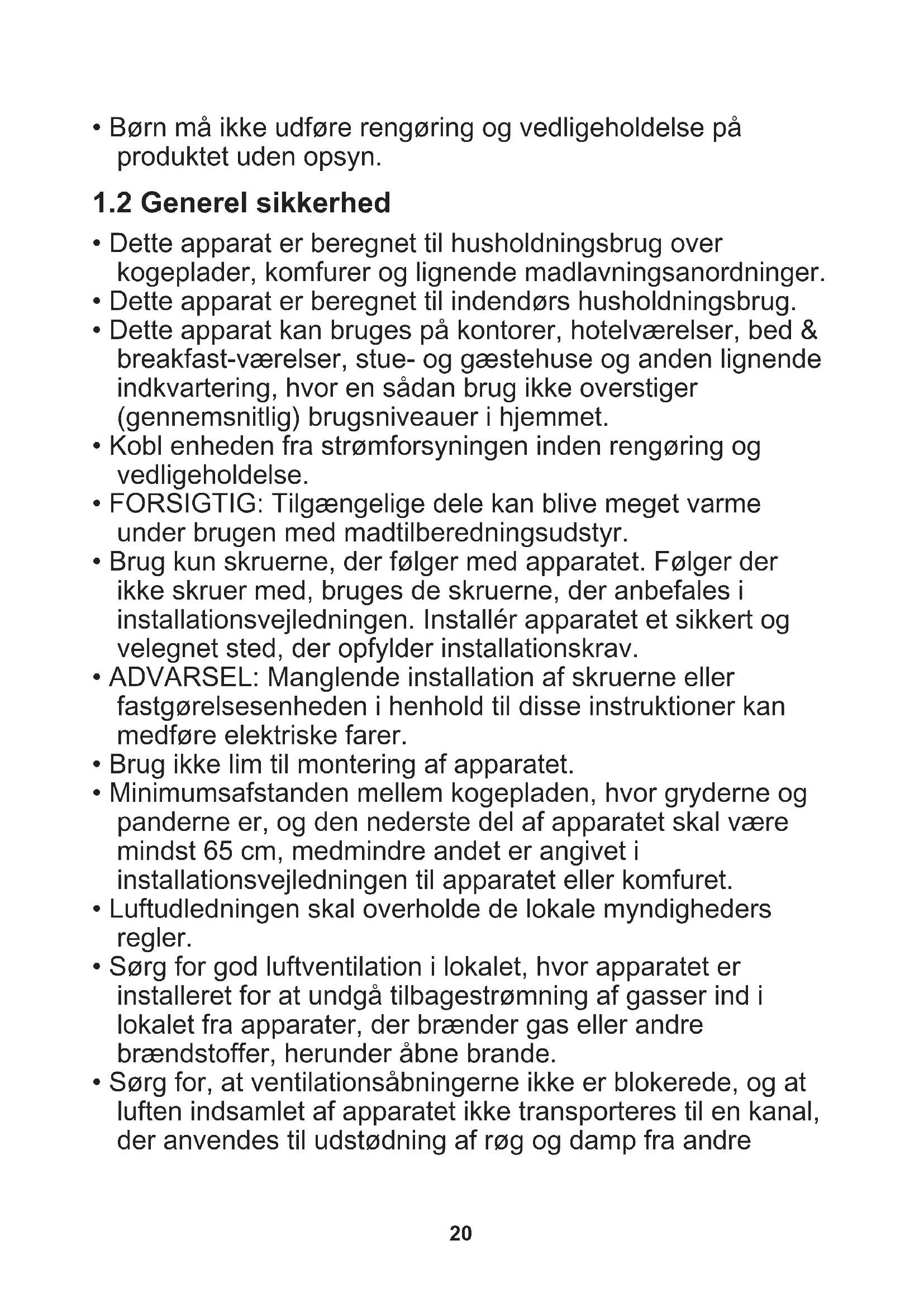 - Dette apparat er beregnet til husholdningsbrug over kogeplader, komfurer og lignende madlavningsanordninger.
