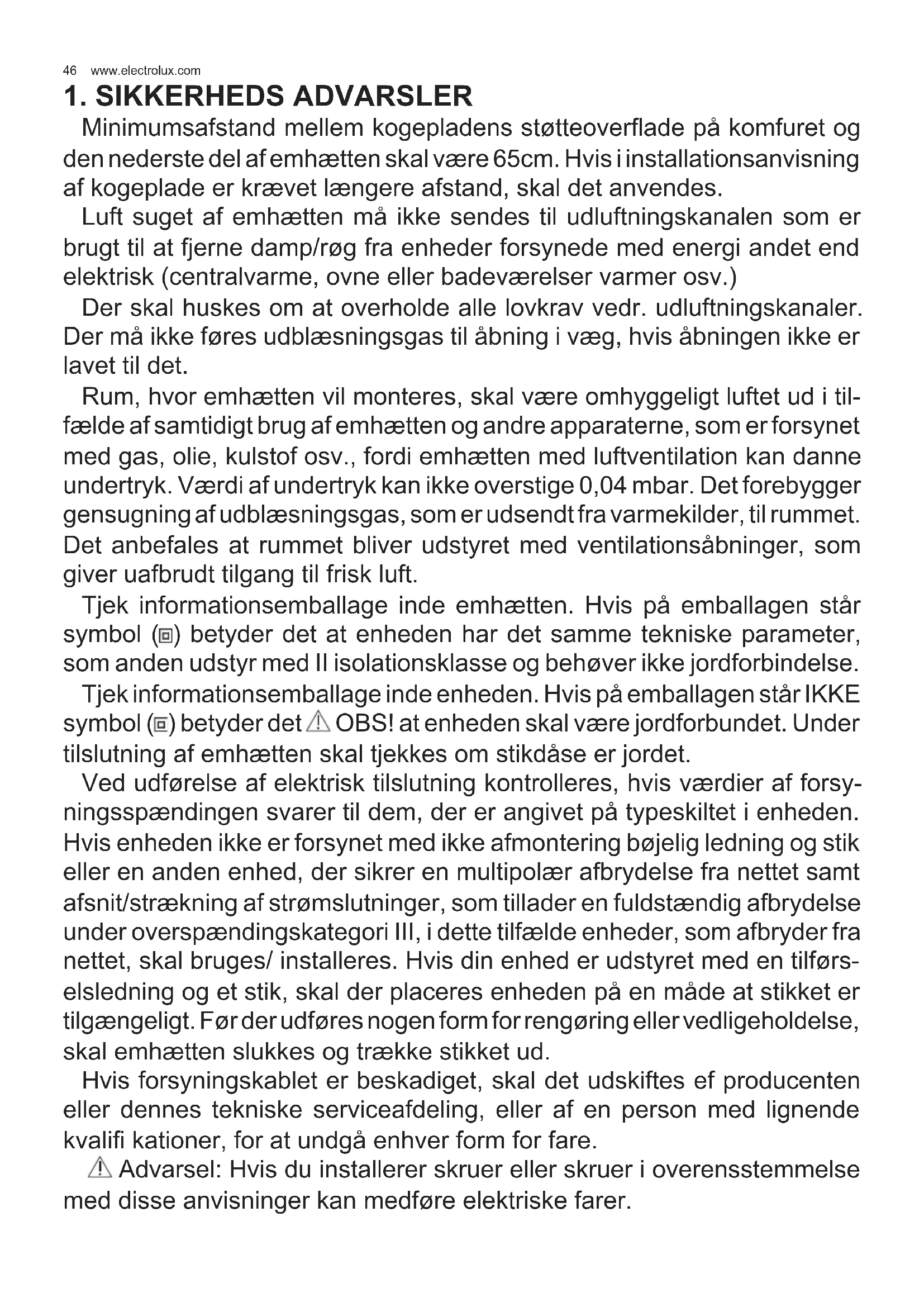Vi anbefaler, at der kun anvendes originale reservedele. Sørg for at have følgende oplysninger parat, når du kontakter det autoriserede servicecenter: Model, Produktkode (PNC), Serienummer. Disse oplysninger fi ndes på typeskiltet. Advarsel / Forsigtig - Vigtige oplysninger vedrørende din sikkerhed Generelle oplysninger og tips Miljøhensyn Med forbehold for ændringer. DANSK46 www.electrolux.com