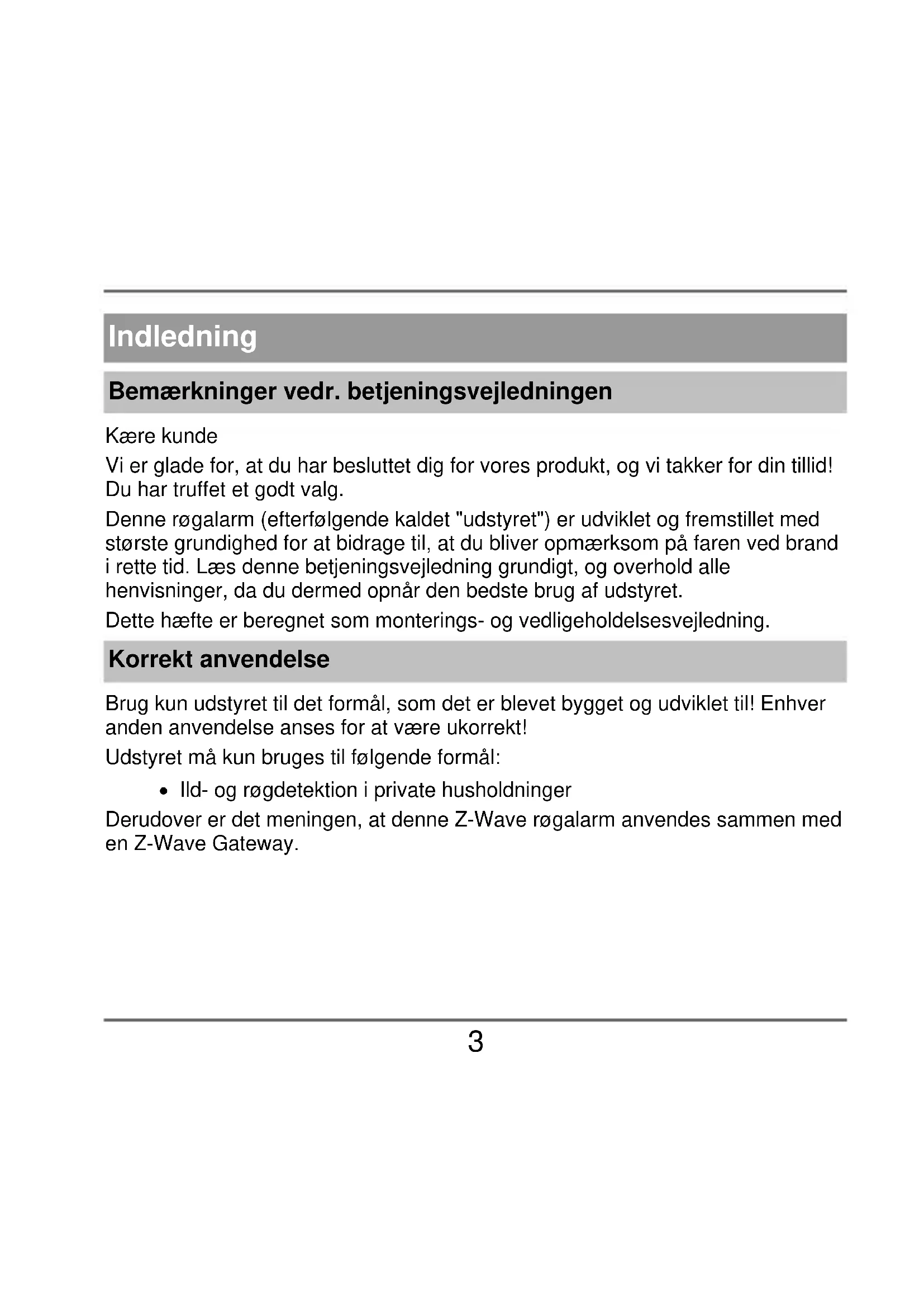 - Ydelseserklæring Indledning Bemærkninger vedr. betjeningsvejledningen Kære kunde Vi er glade for, at du har besluttet dig for vores produkt, og vi takker for din tillid! Du har truffet et godt valg. Denne røgalarm (efterfølgende kaldet "udstyret") er udviklet og fremstillet med største grundighed for at bidrage til, at du bliver opmærksom på faren ved brand i rette tid. Læs denne betjeningsvejledning grundigt, og overhold alle henvisninger, da du dermed opnår den bedste brug af udstyret. Dette hæfte er beregnet som monterings- og vedligeholdelsesvejledning. Korrekt anvendelse Brug kun udstyret til det formål, som det er blevet bygget og udviklet til! Enhver anden anvendelse anses for at være ukorrekt! Udstyret må kun bruges til følgende formål: Ild- og røgdetektion i private husholdninger Derudover er det meningen, at denne Z-Wave røgalarm anvendes sammen med en Z-Wave Gateway.4 Begrænsning af ansvar Dine rettigheder begrænser sig til reparation eller erstatning af produktet, som det blev leveret. ABUS Security-Center påtager sig intet ansvar for specielle, forbigående opståede skader eller følgeskader, inklusive, men ikke begrænset til opståede indtægtstab, tab af fortjeneste, begrænsninger ved anvendelse af software, tab eller genskabelse af data, omkostninger til erstatningsanordninger, nedetid, materielle skader og krav fra tredjemand, som følge af bl.a. kontraktmæssige, lovmæssige eller erstatningsretlige istandsættelseskrav opstået af garantien, uagtet andre begrænsede eller ved lov forudsatte garantibestemmelser, eller i tilfælde af, at den begrænsede garanti ikke gælder, begrænser erstatningsansvaret for ABUS Security Center sig til købsprisen på produktet. Indholdet i denne vejledning kan ændres uden forudgående varsel. © ABUS Security-Center GmbH & Co. KG, 10/20185 Sikkerhedsanvisninger Symbolforklaring Der anvendes følgende symboler i vejledningen og på udstyret: Symbol Signalord Betydning p. 263