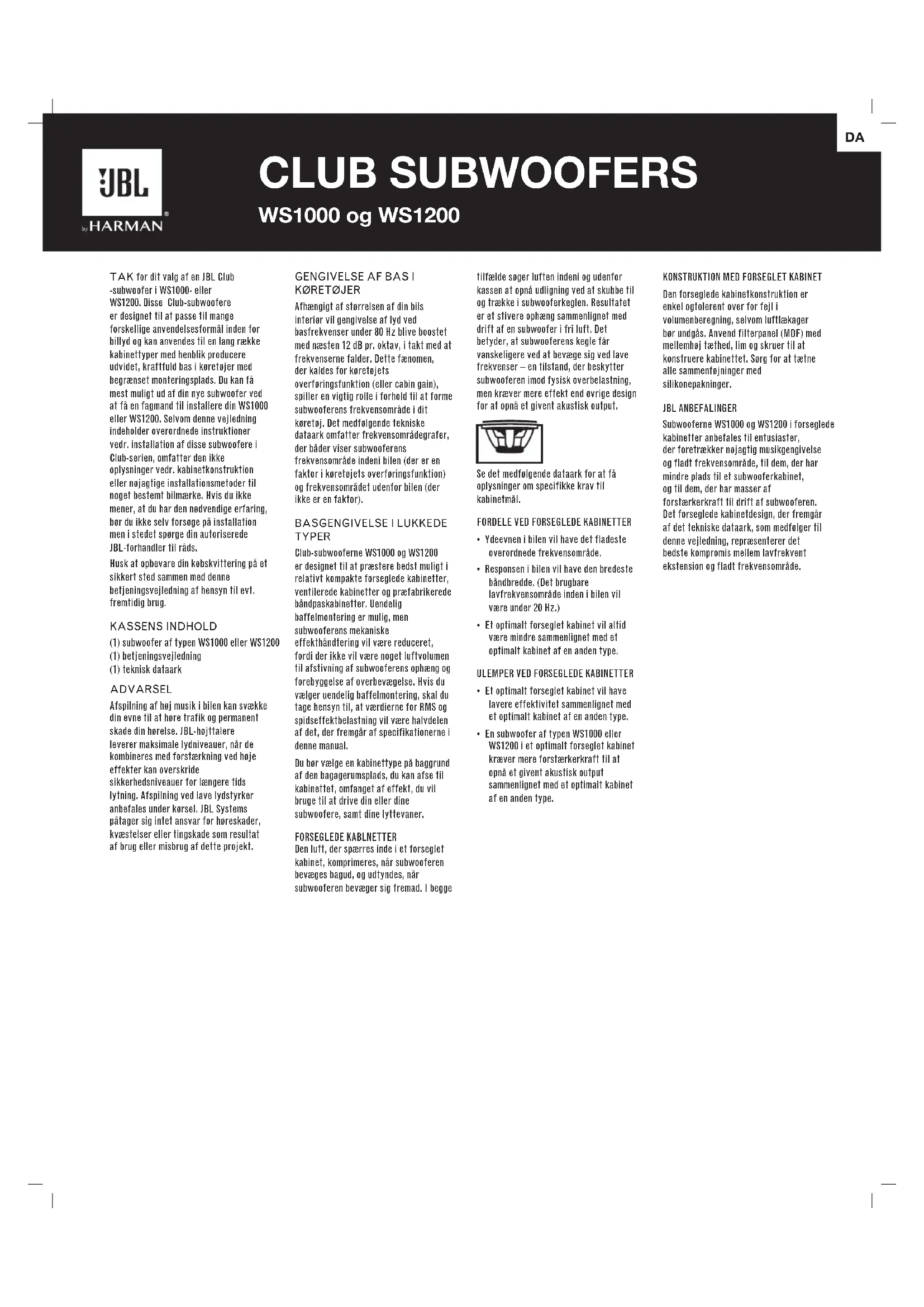 Club WS1000 Club WS1200TAK for dit valg af en JBL Club -subwoofer i WS1000- eller WS1200. Disse Club-subwoofere er designet til at passe til mange forskellige anvendelsesformål inden for billyd og kan anvendes til en lang række kabinettyper med henblik producere udvidet, kraftfuld bas i køretøjer med begrænset monteringsplads. Du kan få mest muligt ud af din nye subwoofer ved at få en fagmand til installere din WS1000 eller WS1200. Selvom denne vejledning indeholder overordnede instruktioner vedr. installation af disse subwoofere i Club-serien, omfatter den ikke oplysninger vedr. kabinetkonstruktion eller nøjagtige installationsmetoder til noget bestemt bilmærke. Hvis du ikke mener, at du har den nødvendige erfaring, bør du ikke selv forsøge på installation men i stedet spørge din autoriserede JBL-forhandler til råds. Husk at opbevare din købskvittering på et sikkert sted sammen med denne betjeningsvejledning af hensyn til evt. fremtidig brug. KASSENS INDHOLD (1) subwoofer af typen WS1000 eller WS1200 (1) betjeningsvejledning (1) teknisk dataark ADVARSEL Afspilning af høj musik i bilen kan svække din evne til at høre trafik og permanent skade din hørelse. JBL-højttalere leverer maksimale lydniveauer, når de kombineres med forstærkning ved høje effekter kan overskride sikkerhedsniveauer for længere tids lytning. Afspilning ved lave lydstyrker anbefales under kørsel. JBL Systems påtager sig intet ansvar for høreskader, kvæstelser eller tingskade som resultat af brug eller misbrug af dette projekt. tilfælde søger luften indeni og udenfor kassen at opnå udligning ved at skubbe til og trække i subwooferkeglen. Resultatet er et stivere ophæng sammenlignet med drift af en subwoofer i fri luft. Det betyder, at subwooferens kegle får vanskeligere ved at bevæge sig ved lave frekvenser – en tilstand, der beskytter subwooferen imod fysisk overbelastning, men kræver mere effekt end øvrige design for at opnå et givent akustisk output. Se det medfølgende dataark for at få oplysninger om specifikke krav til kabinetmål.