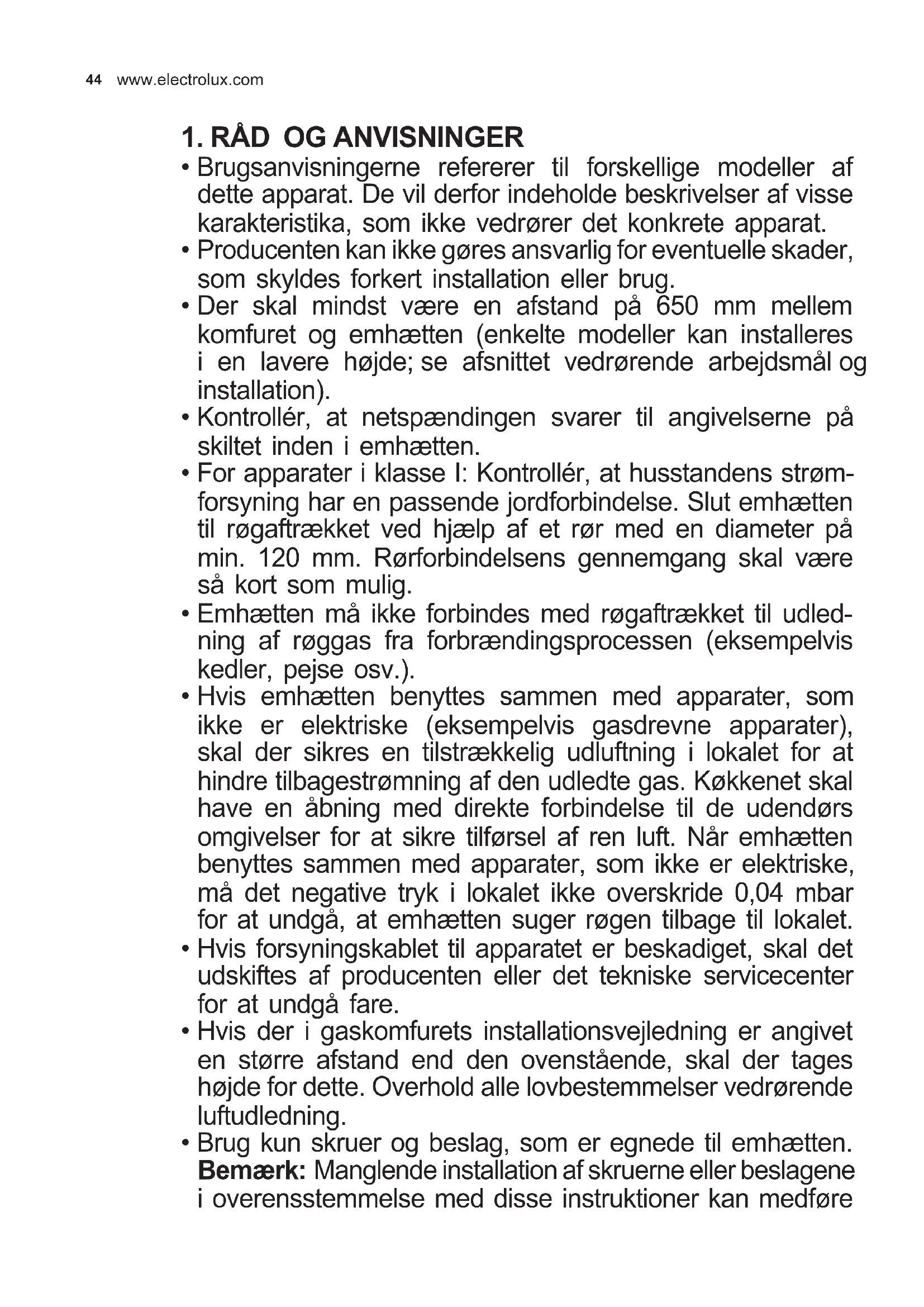 - Hvis emhætten benyttes sammen med apparater, som ikke er elektriske (eksempelvis gasdrevne apparater), skal der sikres en tilstrækkelig udluftning i lokalet for at hindre tilbagestrømning af den udledte gas. Køkkenet skal have en åbning med direkte forbindelse til de udendørs omgivelser for at sikre tilførsel af ren luft. Når emhætten benyttes sammen med apparater, som ikke er elektriske, må det negative tryk i lokalet ikke overskride 0,04 mbar for at undgå, at emhætten suger røgen tilbage til lokalet.