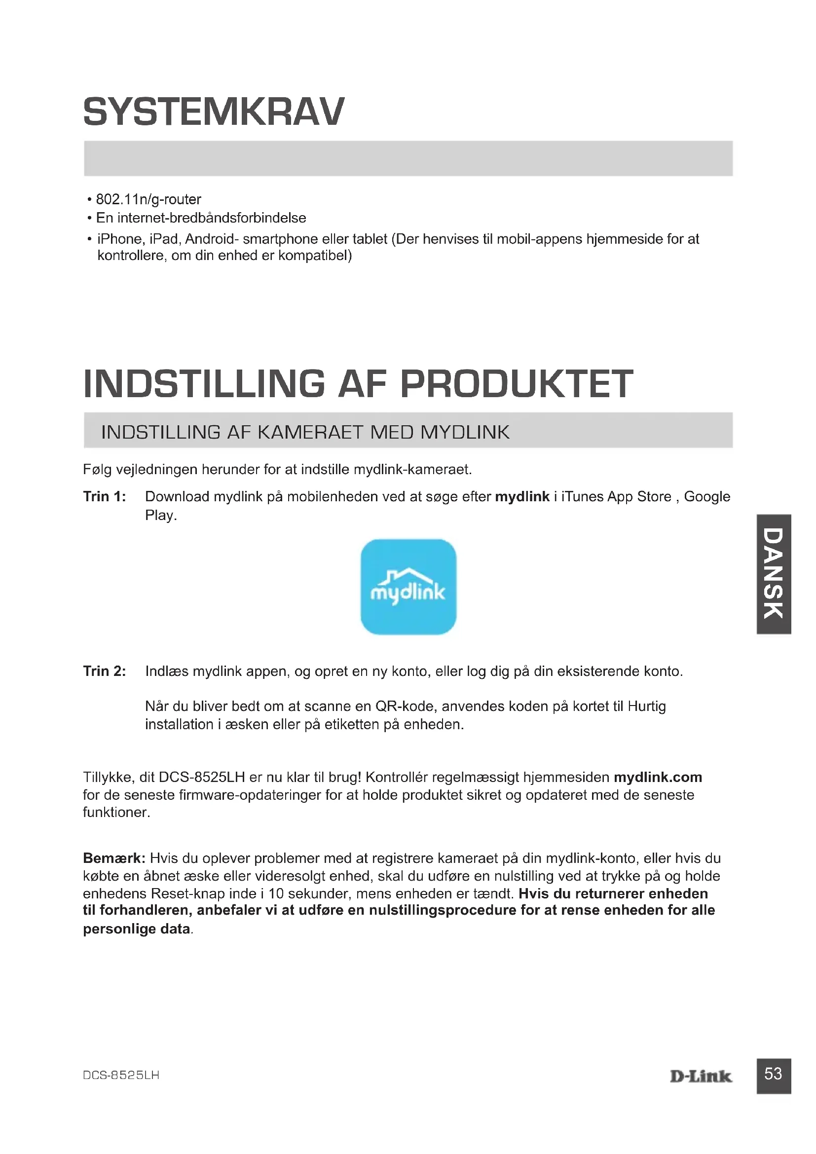 - iPhone, iPad, Android- smartphone eller tablet (Der henvises til mobil-appens hjemmeside for at kontrollere, om din enhed er kompatibel)Følg vejledningen herunder for at indstille mydlink-kameraet.Tillykke, dit DCS-8525LH er nu klar til brug! Kontrollér regelmæssigt hjemmesiden mydlink.com for de seneste rmware-opdateringer for at holde produktet sikret og opdateret med de seneste funktioner. Bemærk: Hvis du oplever problemer med at registrere kameraet på din mydlink-konto, eller hvis du købte en åbnet æske eller videresolgt enhed, skal du udføre en nulstilling ved at trykke på og holde enhedens Reset-knap inde i 10 sekunder, mens enheden er tændt. Hvis du returnerer enheden til forhandleren, anbefaler vi at udføre en nulstillingsprocedure for at rense enheden for alle personlige data. Trin 1: Download mydlink på mobilenheden ved at søge efter mydlink i iTunes App Store , Google Play. Trin 2: Indlæs mydlink appen, og opret en ny konto, eller log dig på din eksisterende konto. Når du bliver bedt om at scanne en QR-kode, anvendes koden på kortet til Hurtig installation i æsken eller på etiketten på enheden.