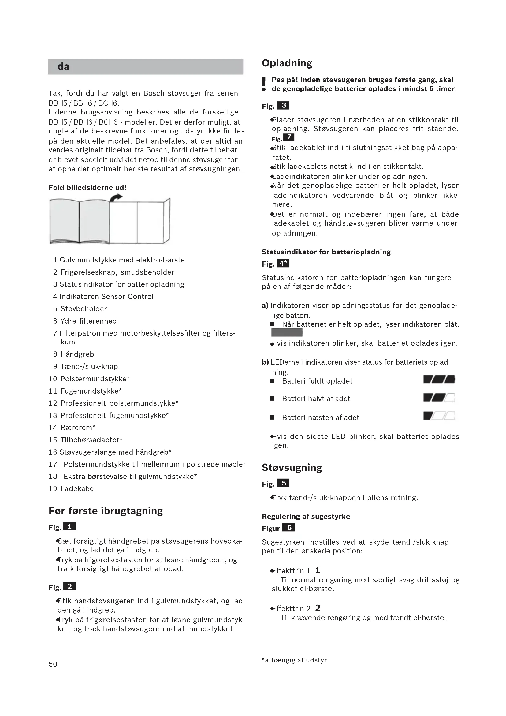 Tak, fordi du har valgt en Bosch støvsuger fra serien BBH5 / BBH6 / BCH6. I denne brugsanvisning beskrives alle de forskellige BBH5 / BBH6 / BCH6 - modeller. Det er derfor muligt, at nogle af de beskrevne funktioner og udstyr ikke findes på den aktuelle model. Det anbefales, at der altid an- vendes originalt tilbehør fra Bosch, fordi dette tilbehør er blevet specielt udviklet netop til denne støvsuger for at opnå det optimalt bedste resultat af støvsugningen. Fold billedsiderne ud! 1 Gulvmundstykke med elektro-børste 2 Frigørelsesknap, smudsbeholder 3 Statusindikator for batteriopladning 4 Indikatoren Sensor Control 5 Støvbeholder 6 Ydre filterenhed 7 Filterpatron med motorbeskyttelsesfilter og filters- kum 8 Håndgreb 9 Tænd-/sluk-knap 10 Polstermundstykke* 11 Fugemundstykke* 12 Professionelt polstermundstykke* 13 Professionelt fugemundstykke* 14 Bærerem* 15 Tilbehørsadapter* 16 Støvsugerslange med håndgreb* 17 Polstermundstykke til mellemrum i polstrede møbler 18 Ekstra børstevalse til gulvmundstykke* 19 Ladekabel Før første ibrugtagning Fig.