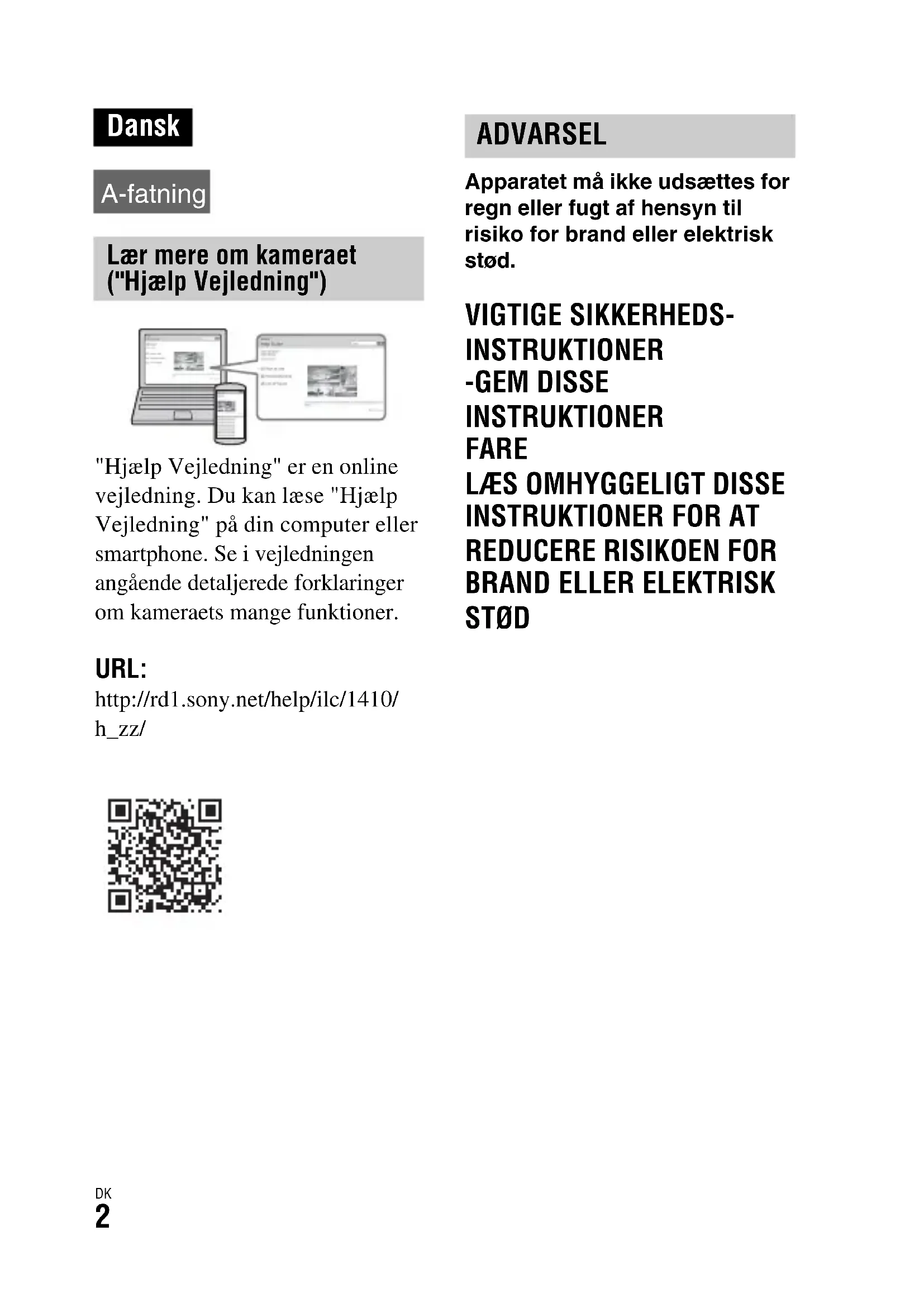 "Hjælp Vejledning" er en online vejledning. Du kan læse "Hjælp Vejledning" på din computer eller smartphone. Se i vejledningen angående detaljerede forklaringer om kameraets mange funktioner. URL: http://rd1.sony.net/help/ilc/1410/ h_zz/ Apparatet må ikke udsættes for regn eller fugt af hensyn til risiko for brand eller elektrisk stød. VIGTIGE SIKKERHEDS- INSTRUKTIONER -GEM DISSE INSTRUKTIONER FARE