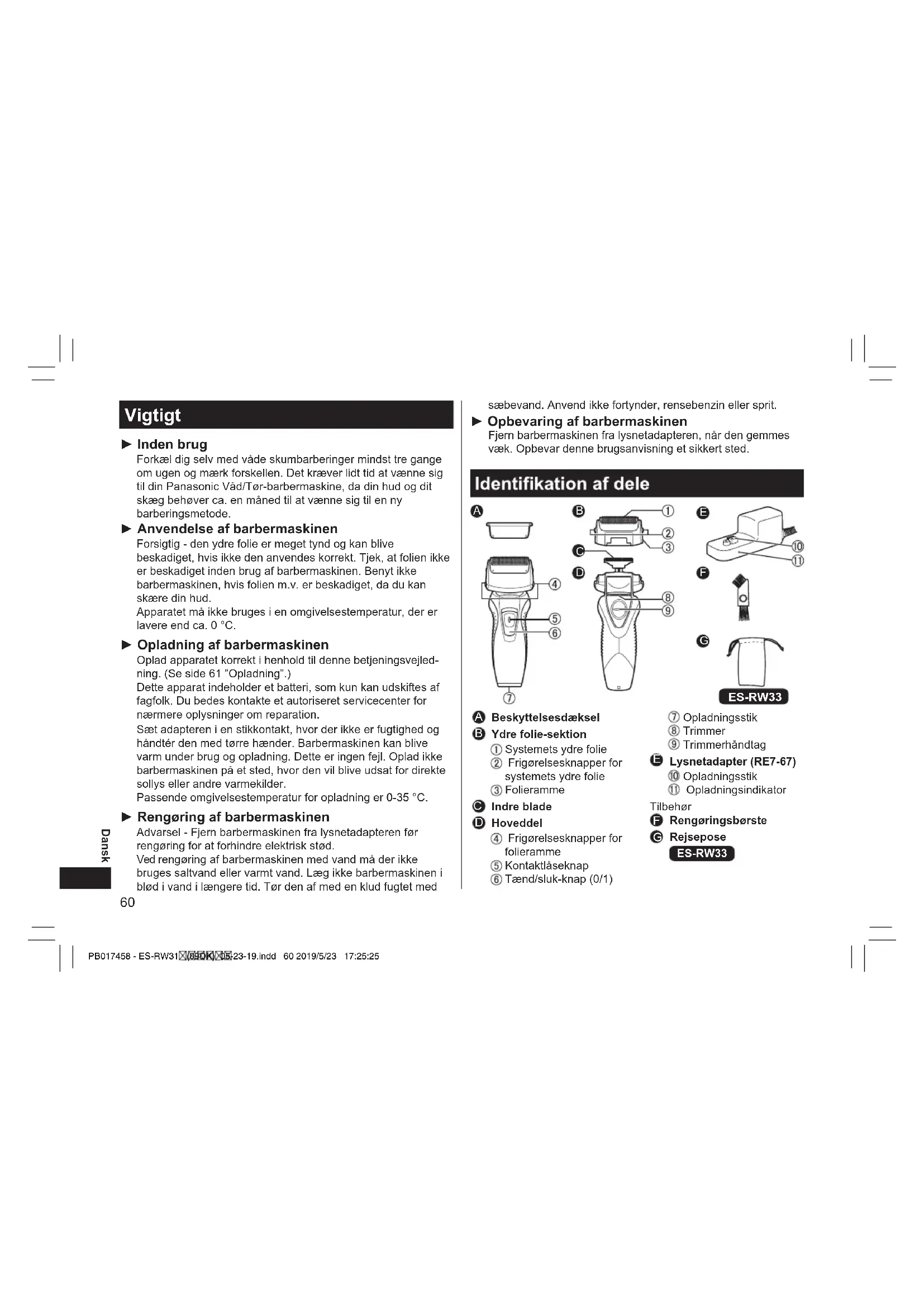 - Detfølgendesymbolangiver,atderkrævesenspecik aftagelig strømforsyning for at slutte det elektriske apparat til el-nettet. Strømforsyningens typereference er markeret i nærheden af symbolet. PB017458 - ES-RW31_(09DK)_05-23-19.indd 59 2019/5/23 17:25:2460 Dansk Vigtigt ► Inden brug Forkæl dig selv med våde skumbarberinger mindst tre gange om ugen og mærk forskellen. Det kræver lidt tid at vænne sig til din Panasonic Våd/Tør-barbermaskine, da din hud og dit skæg behøver ca. en måned til at vænne sig til en ny barberingsmetode. ► Anvendelse af barbermaskinen Forsigtig - den ydre folie er meget tynd og kan blive beskadiget, hvis ikke den anvendes korrekt. Tjek, at folien ikke er beskadiget inden brug af barbermaskinen. Benyt ikke barbermaskinen, hvis folien m.v. er beskadiget, da du kan skære din hud. Apparatet må ikke bruges i en omgivelsestemperatur, der er lavere end ca. 0 °C. ► Opladning af barbermaskinen Sæt adapteren i en stikkontakt, hvor der ikke er fugtighed og håndtér den med tørre hænder. Barbermaskinen kan blive varm under brug og opladning. Dette er ingen fejl. Oplad ikke barbermaskinen på et sted, hvor den vil blive udsat for direkte sollys eller andre varmekilder. Passende omgivelsestemperatur for opladning er 0-35 °C. ► Rengøring af barbermaskinen Advarsel - Fjern barbermaskinen fra lysnetadapteren før rengøring for at forhindre elektrisk stød. Ved rengøring af barbermaskinen med vand må der ikke bruges saltvand eller varmt vand. Læg ikke barbermaskinen i blød i vand i længere tid. Tør den af med en klud fugtet med sæbevand. Anvend ikke fortynder, rensebenzin eller sprit. ► Opbevaring af barbermaskinen Fjern barbermaskinen fra lysnetadapteren, når den gemmes væk. Opbevar denne brugsanvisning et sikkert sted.