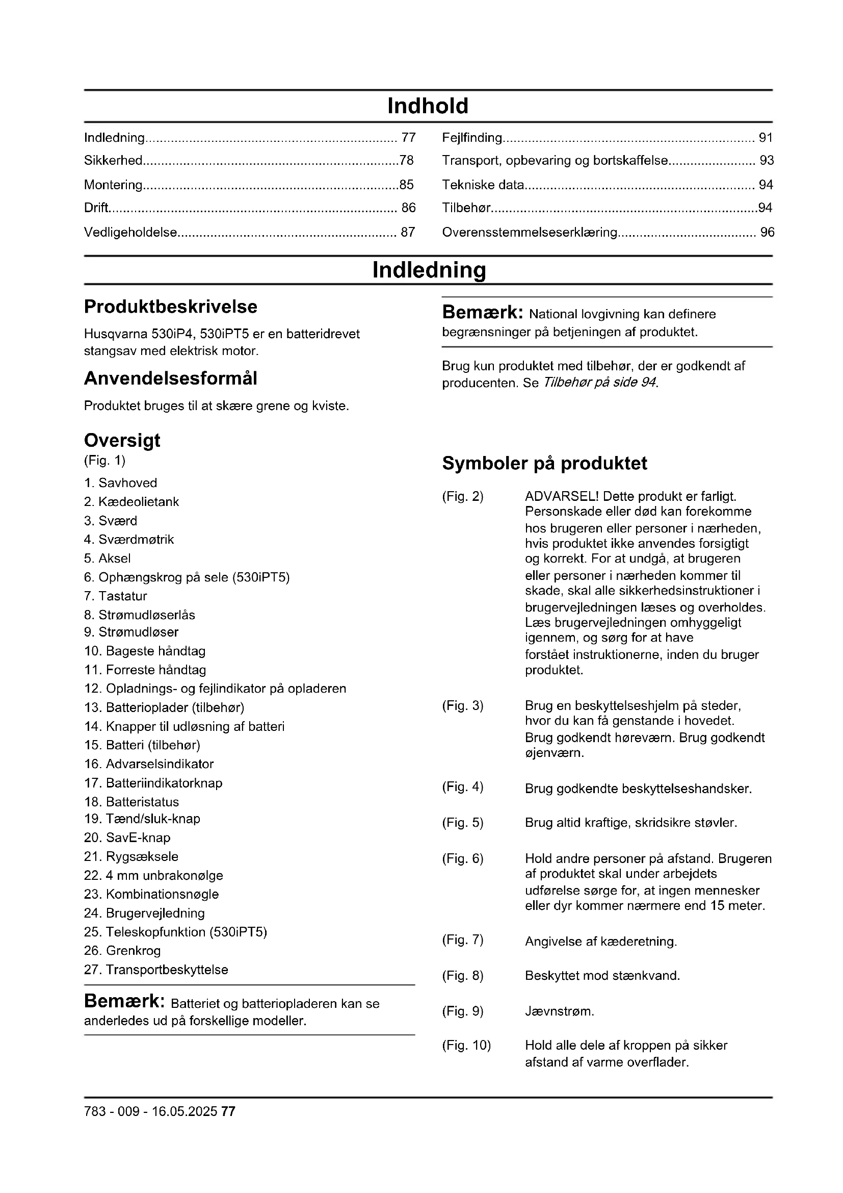 Bemærk: Batteriet og batteriopladeren kan se anderledes ud på forskellige modeller. Symboler på produktet (Fig. 2) ADVARSEL! Dette produkt er farligt. Personskade eller død kan forekomme hos brugeren eller personer i nærheden, hvis produktet ikke anvendes forsigtigt og korrekt. For at undgå, at brugeren eller personer i nærheden kommer til skade, skal alle sikkerhedsinstruktioner i brugervejledningen læses og overholdes. Læs brugervejledningen omhyggeligt igennem, og sørg for at have forstået instruktionerne, inden du bruger produktet. (Fig. 3) Brug en beskyttelseshjelm på steder, hvor du kan få genstande i hovedet. Brug godkendt høreværn. Brug godkendt øjenværn. (Fig. 4) Brug godkendte beskyttelseshandsker. (Fig. 5) Brug altid kraftige, skridsikre støvler. (Fig. 6) Hold andre personer på afstand. Brugeren af produktet skal under arbejdets udførelse sørge for, at ingen mennesker eller dyr kommer nærmere end 15 meter. (Fig. 7) Angivelse af kæderetning. (Fig. 8) Beskyttet mod stænkvand. (Fig. 9) Jævnstrøm. (Fig. 10) Hold alle dele af kroppen på sikker afstand af varme overflader.