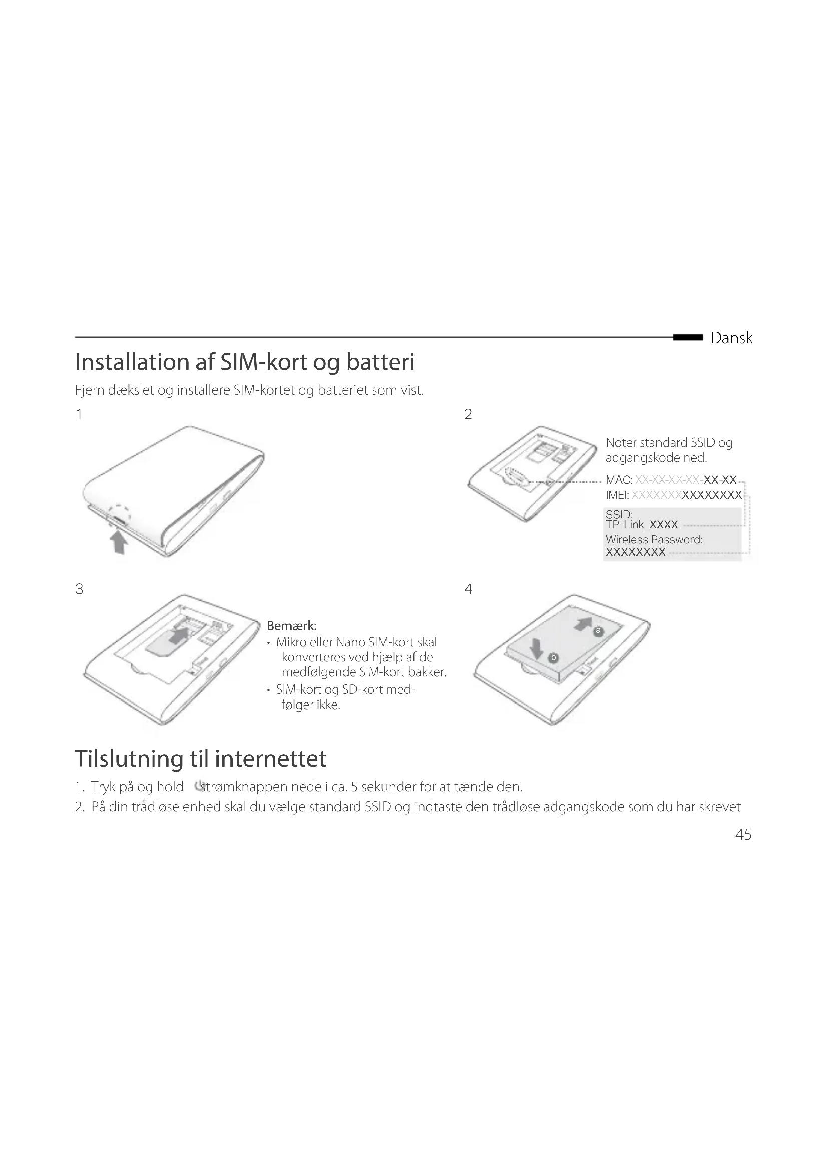 Bemærk:• Mikro eller Nano SIM-kort skal konverteres ved hjælp af de medfølgende SIM-kort bakker. • SIM-kort og SD-kort med-følger ikke.