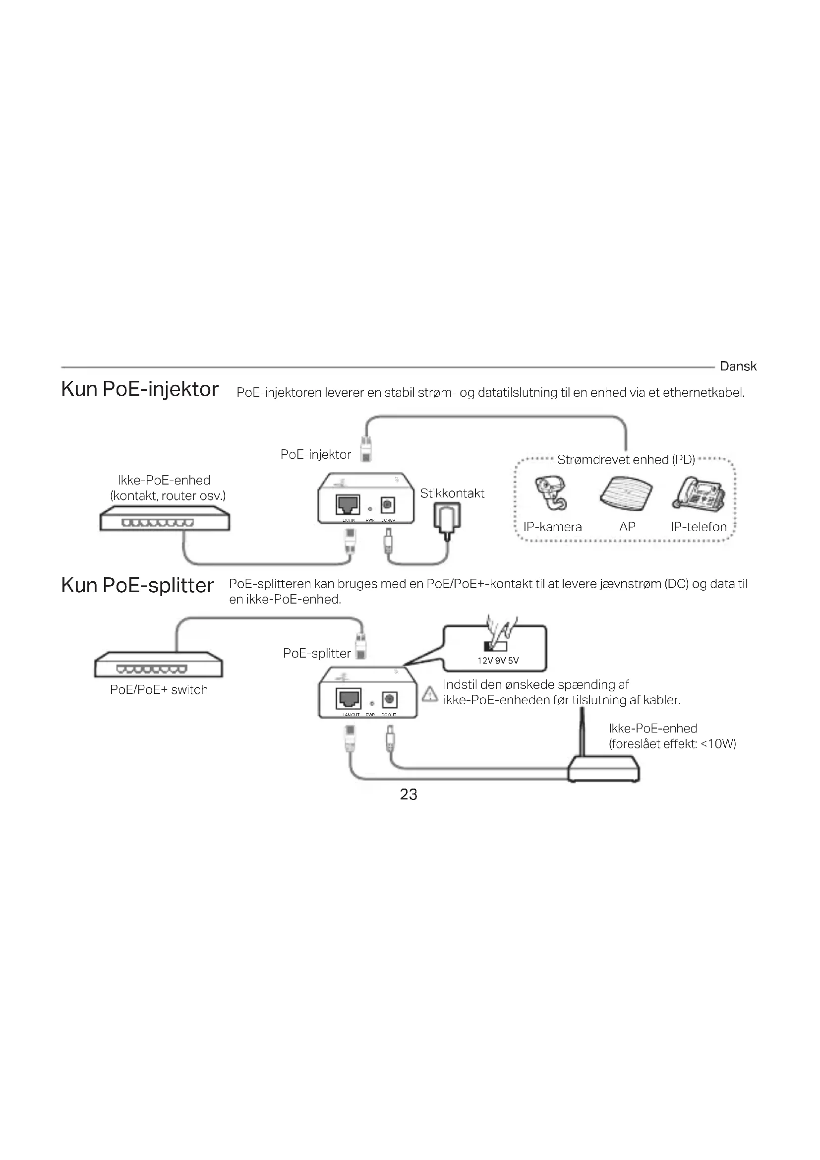 PWR DC OUT PoE Splitter 12V 9V 5V Strømdrevet enhed (PD)Stikkontakt Ikke-PoE-enhed (foreslået eekt: <10W) Dansk PoE-injektor PoE-splitter PoE-injektor og -splitter PoE-injektoren og PoE-splitteren kan bruges som et sæt til at levere strøm og sende data til en ikke-PoE-enhed. Ikke-PoE-enhed (kontakt, router osv.) Indstil den ønskede spænding af ikke-PoE-enheden før tilslutning af kabler. PoE InjectorLAN IN PWR