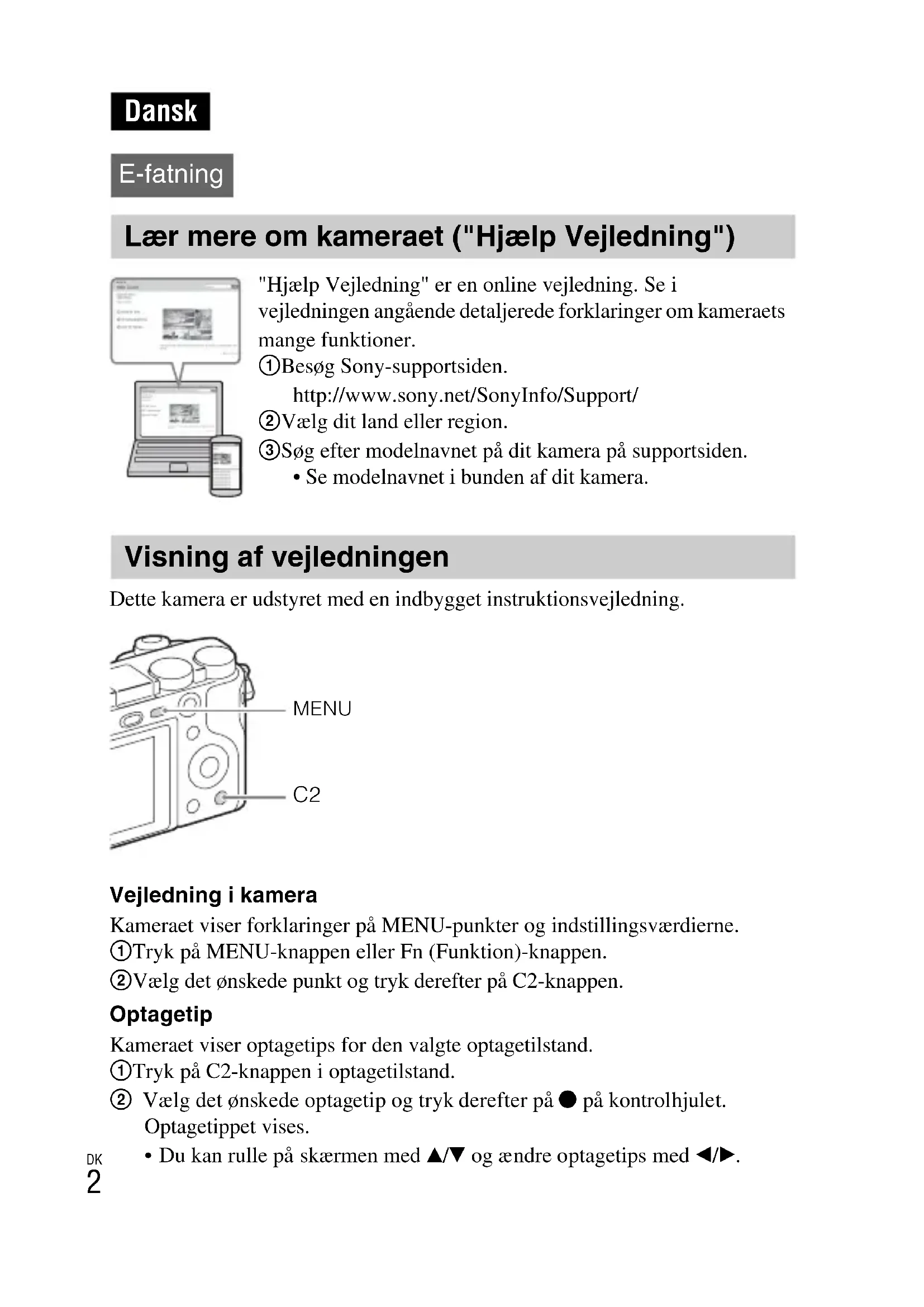 - Du kan rulle på skærmen med v/V og ændre optagetips med b/B. Dansk E-fatning Lær mere om kameraet ("Hjælp Vejledning") "Hjælp Vejledning" er en online vejledning. Se i vejledningen angående detaljerede forklaringer om kameraets mange funktioner. 1 Besøg Sony-supportsiden. http://www.sony.net/SonyInfo/Support/ 2 Vælg dit land eller region. 3 Søg efter modelnavnet på dit kamera på supportsiden.